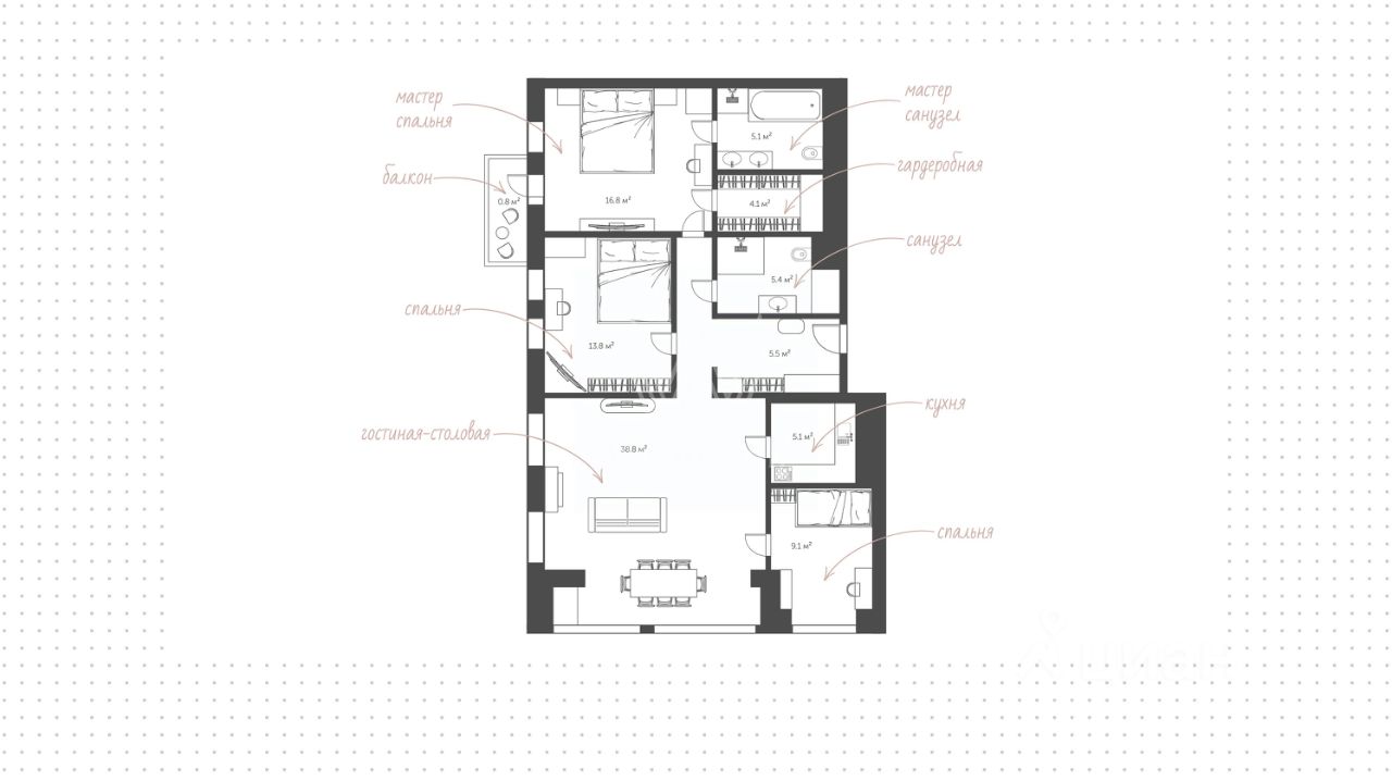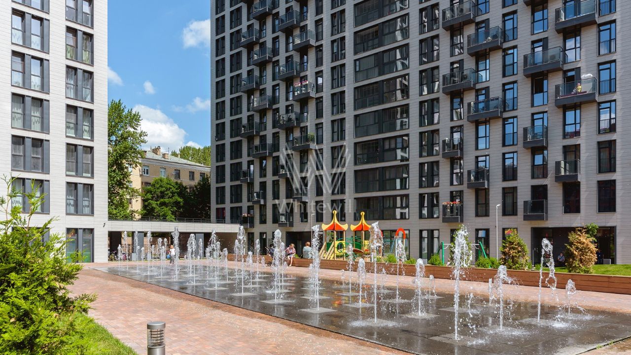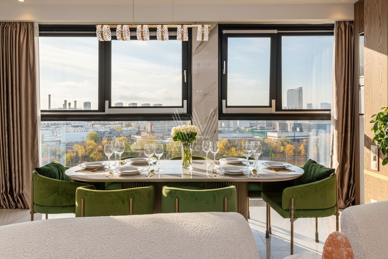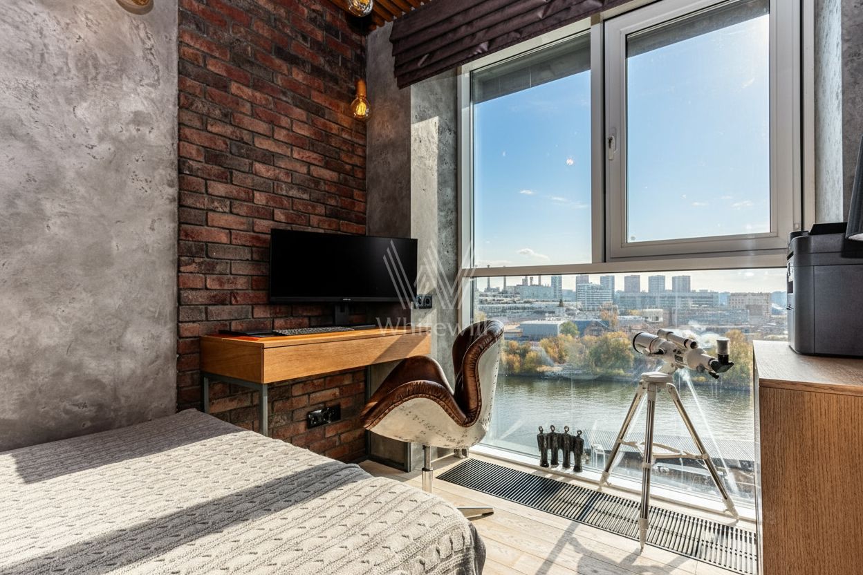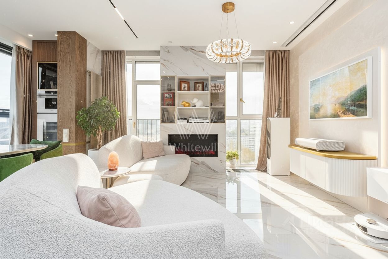 Квартира полностью меблирована и укомплектована бытовой техникой. Функциональная планировка включает гостиную с камином и домашним кинотеатром, кухню, мастер-спальню с собственной ванной комнатой, гардеробной и выходом на балкон, две спальни, санузел с душевой кабиной и холл. Благодаря панорамному остеклению пространство наполнено естественным светом и теплом, открываются виды на город и Москву-реку.
