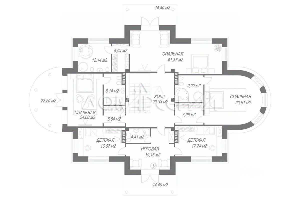 Второй этаж: Мастер-спальня с с/у, 41,5 кв.м. гостевая спальня (33,6кв.м.) со своим с/у и гардеробной, гостевая спальня (24кв.м.) со своим с/у и гардеробной, 2 детские спальни с игровой комнатой и детским с/у