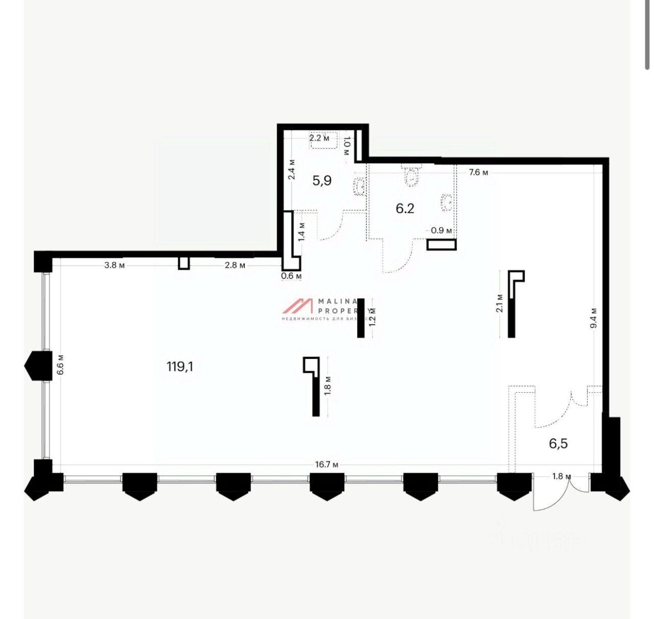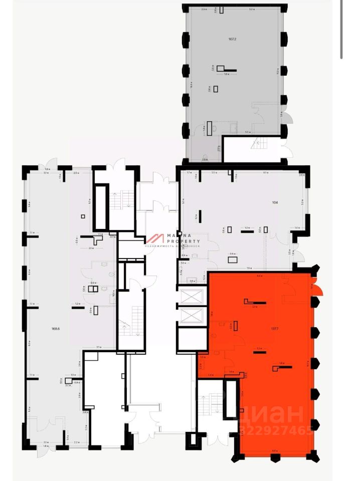 Угловое помещение 138 м2, располагается на 1 этаже, имеет открытую планировку, отдельный вход с фасада, множество витринных окон по фасаду. Электрическая мощность 27 кВт.