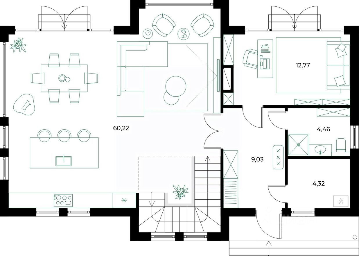 Просторная планировка, современные материалы и панорамные окна.