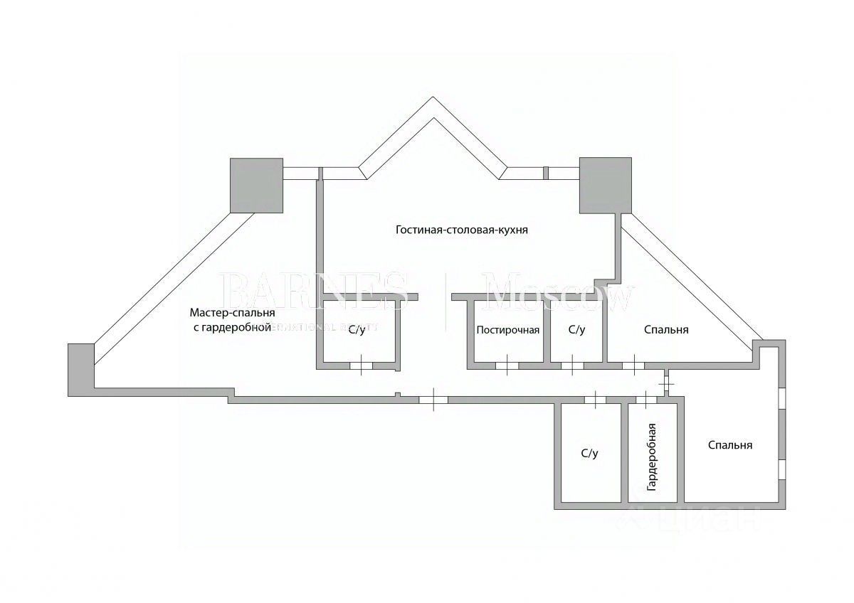 Планировочным решением предусмотрены: просторная гостиная-столовая с зоной кухни, 3 спальни, 3 санузла, гардеробная, постирочная, прихожая с гардеробной зоной.