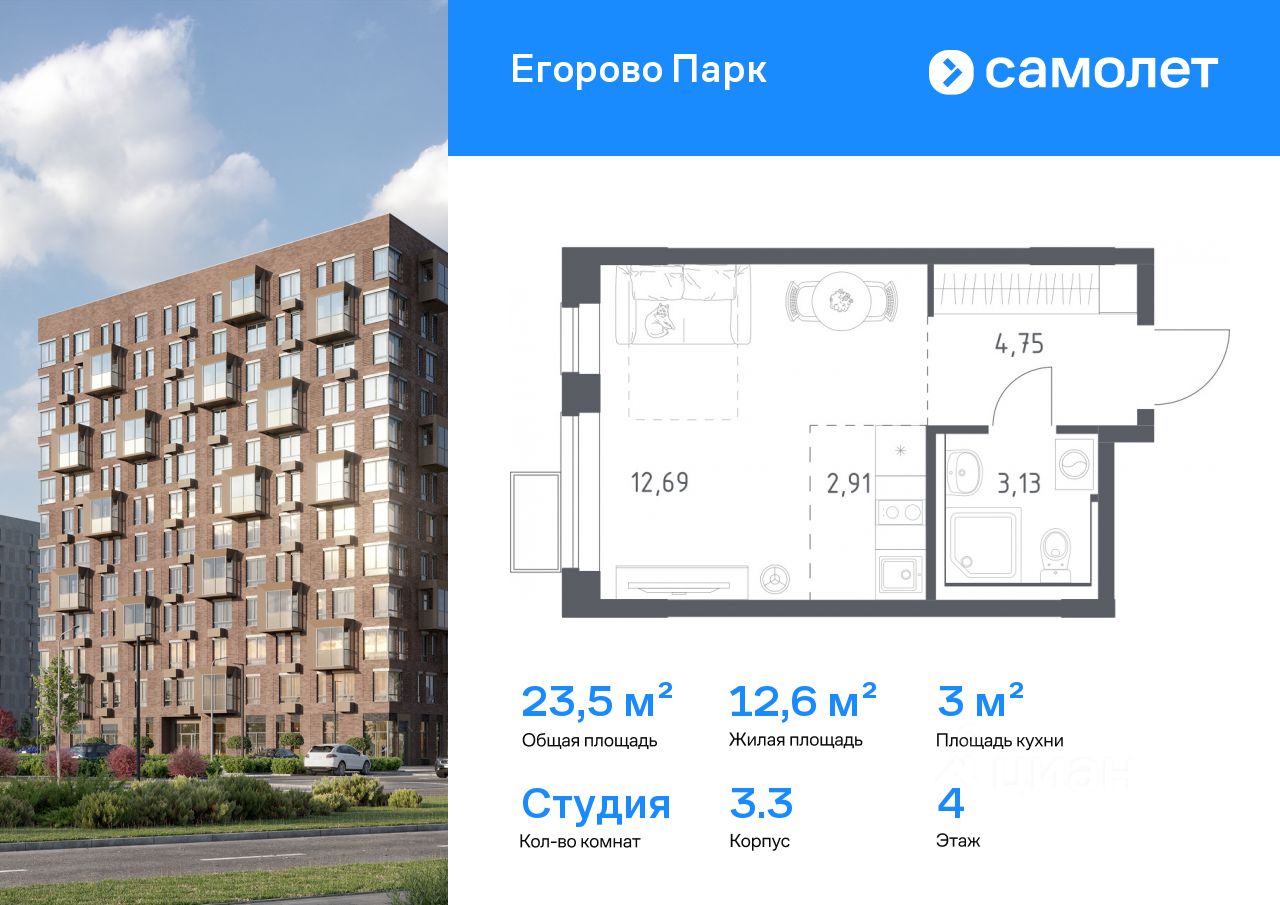 Строим кварталы для жизни с заботой о будущем. Предлагается квартира студия комфорт-класса 23,48 кв.м в корпусе 3.3 на 4 этаже, в ЖК ''Егорово Парк''