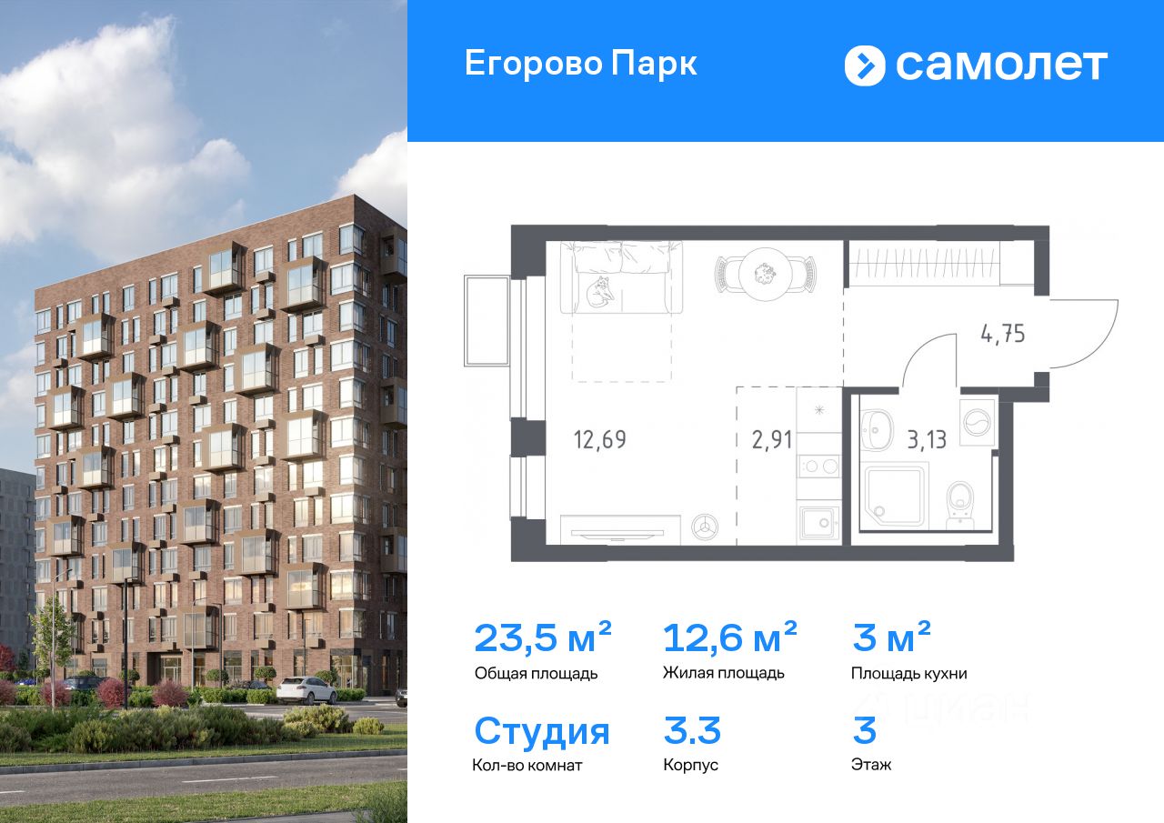 Строим кварталы для жизни с заботой о будущем. Предлагается квартира студия комфорт-класса 23,48 кв.м в корпусе 3.3 на 3 этаже, в ЖК ''Егорово Парк''