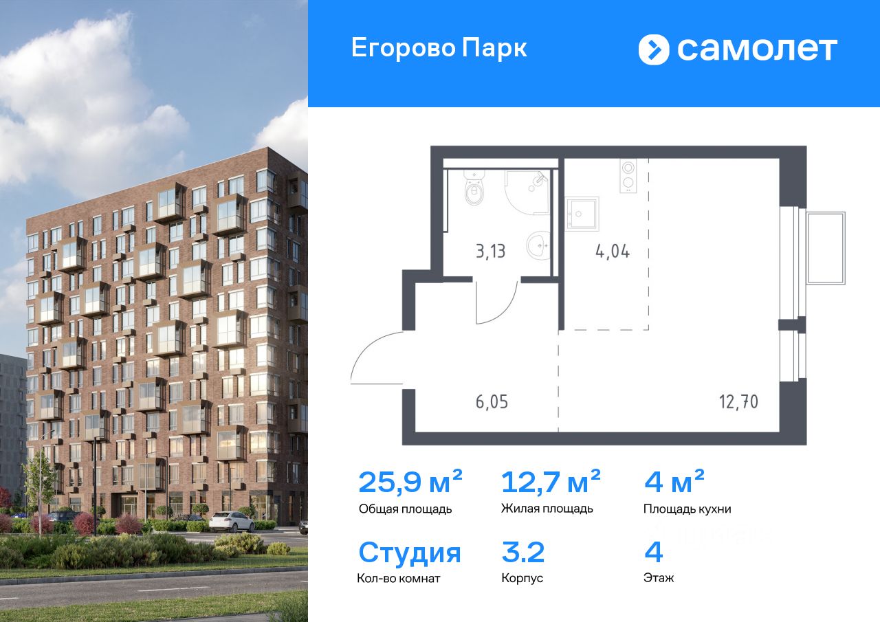 Строим кварталы для жизни с заботой о будущем. Предлагается квартира студия комфорт-класса 25,92 кв.м в корпусе 3.2 на 4 этаже, в ЖК ''Егорово Парк''