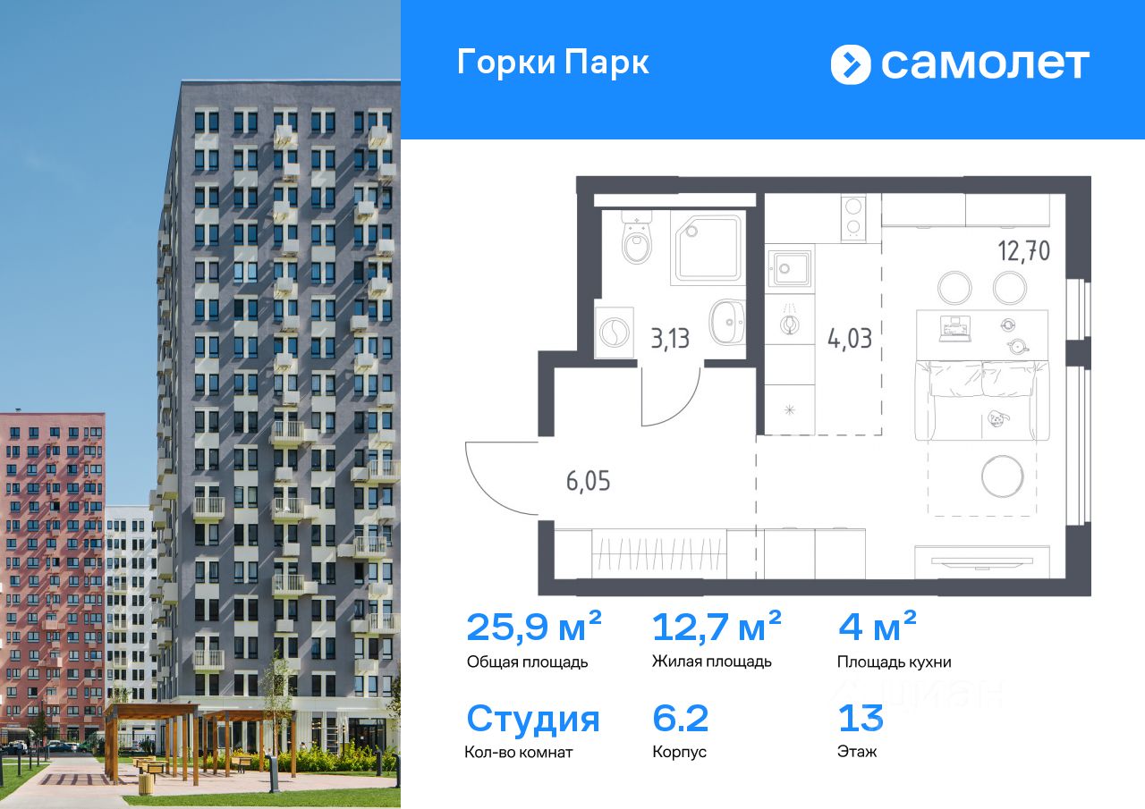 Строим кварталы для жизни с заботой о будущем. Предлагается квартира студия комфорт-класса 25,91 кв.м в корпусе 6.2 на 13 этаже, в ЖК ''Горки Парк'' Квартира с чистовой отделкой. Доступность дополнительных опций уточняйте у застройщика.