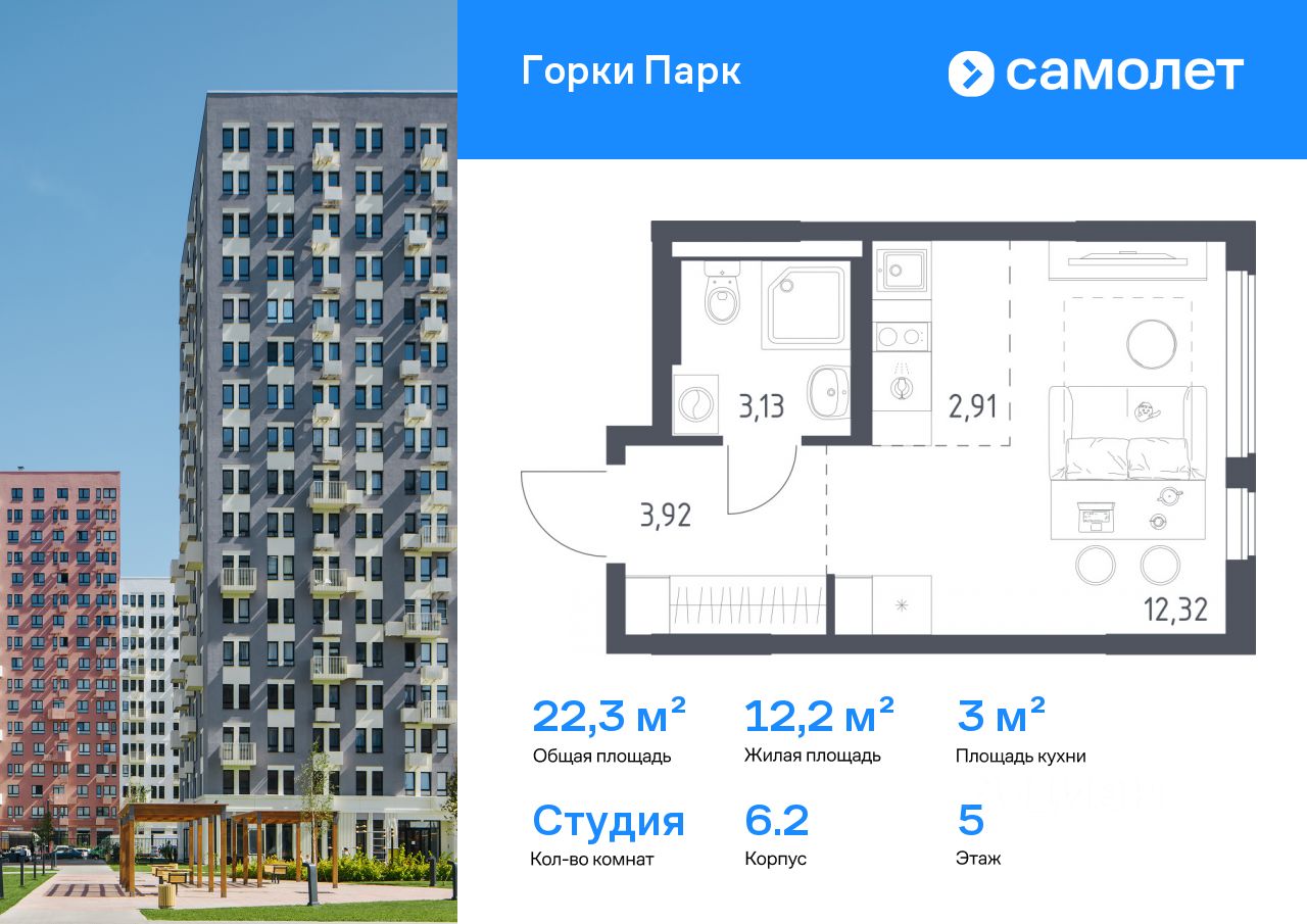 Строим кварталы для жизни с заботой о будущем. Предлагается квартира студия комфорт-класса 22,28 кв.м в корпусе 6.2 на 5 этаже, в ЖК ''Горки Парк'' Квартира с чистовой отделкой. Доступность дополнительных опций уточняйте у застройщика.