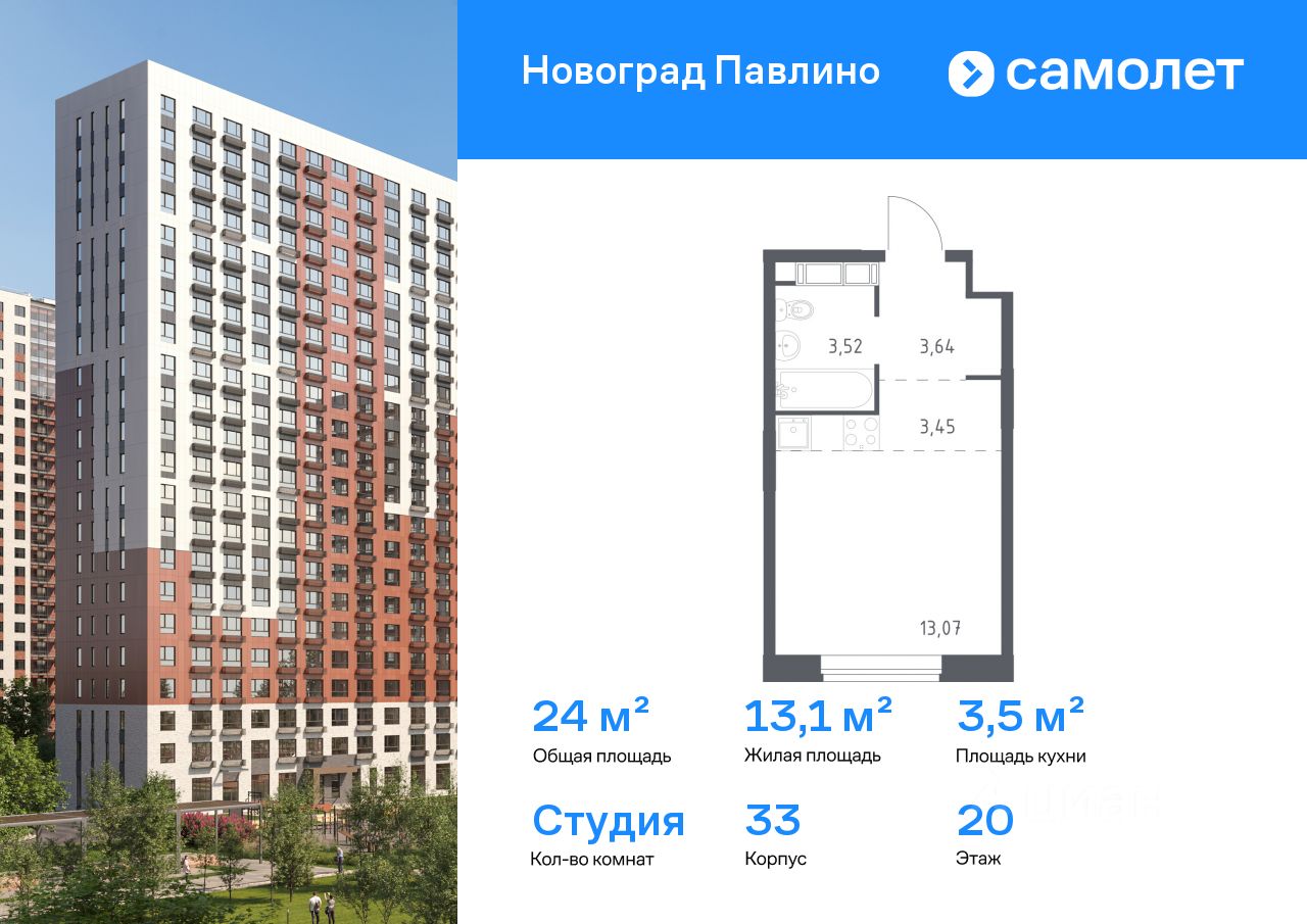 Строим кварталы для жизни с заботой о будущем. Предлагается квартира студия комфорт-класса 24 кв.м в корпусе 33 на 20 этаже, в ЖК ''Новоград Павлино''