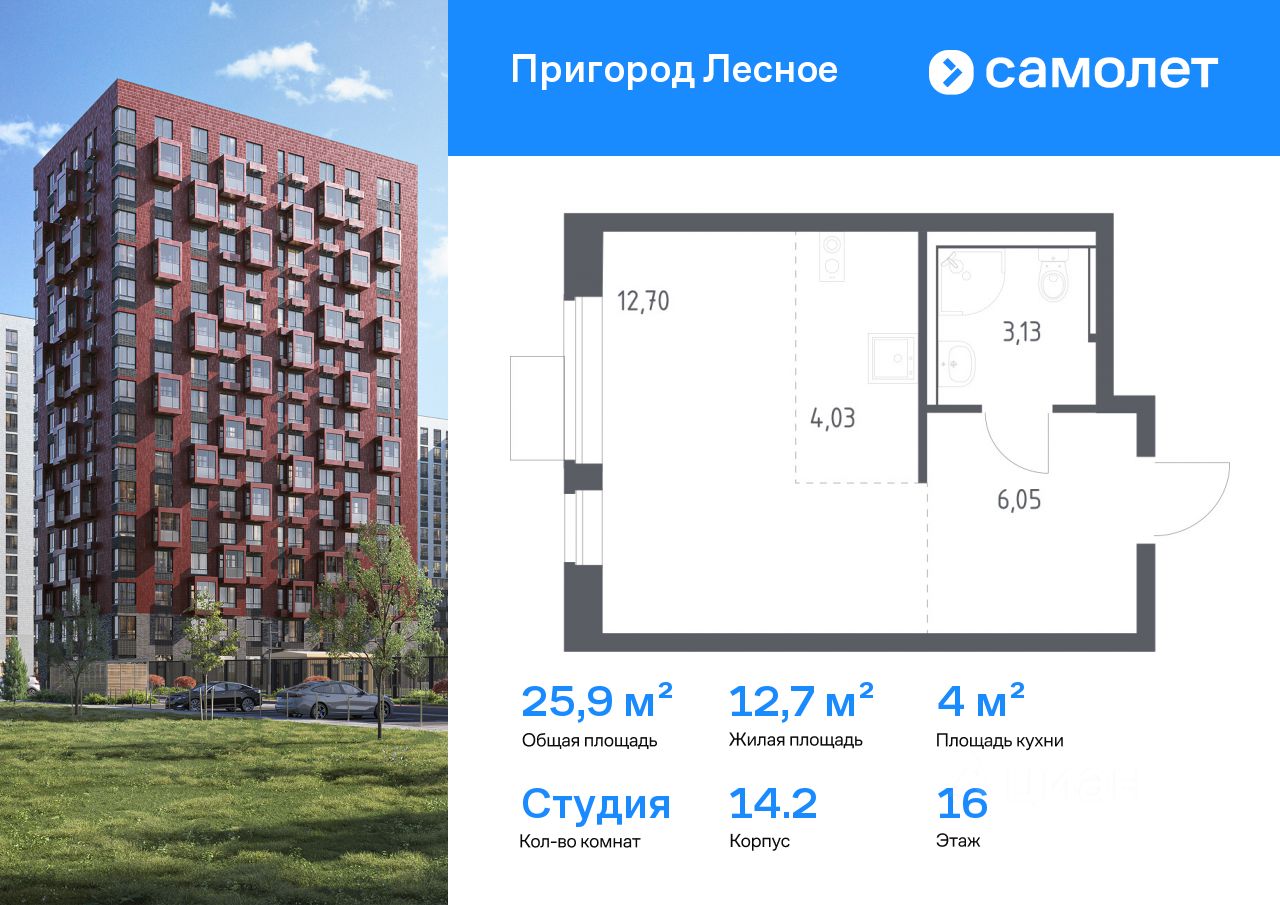 Строим кварталы для жизни с заботой о будущем. Предлагается квартира студия комфорт-класса 25,91 кв.м в корпусе 14.2 на 16 этаже, в ЖК ''Пригород Лесное'' Квартира с чистовой отделкой. Доступность дополнительных опций уточняйте у застройщика.