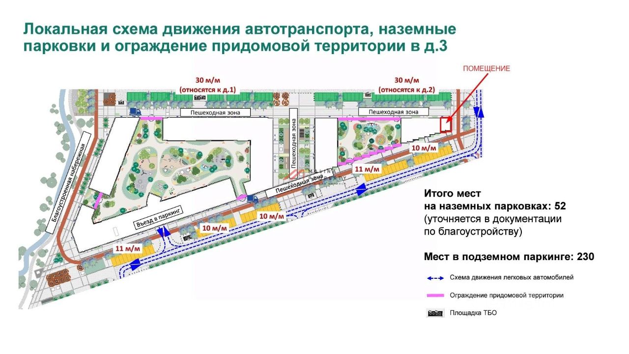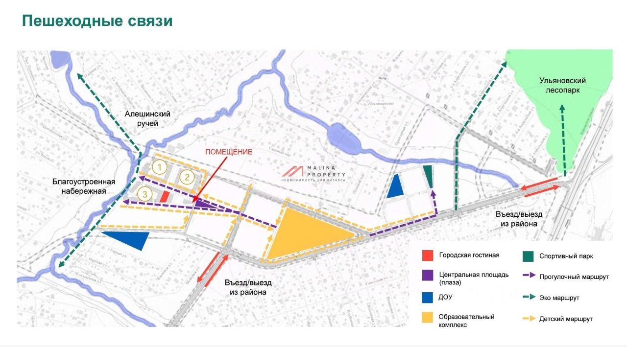 Помещение располагается в лучшем месте жилого комплекса, на пересечении дорог и пешеходного бульвара, в самом центре жилого комплекса. Интенсивный автомобильный и пешеходный трафик вдоль помещения. ЖК рассчитан 21 000 жителей.