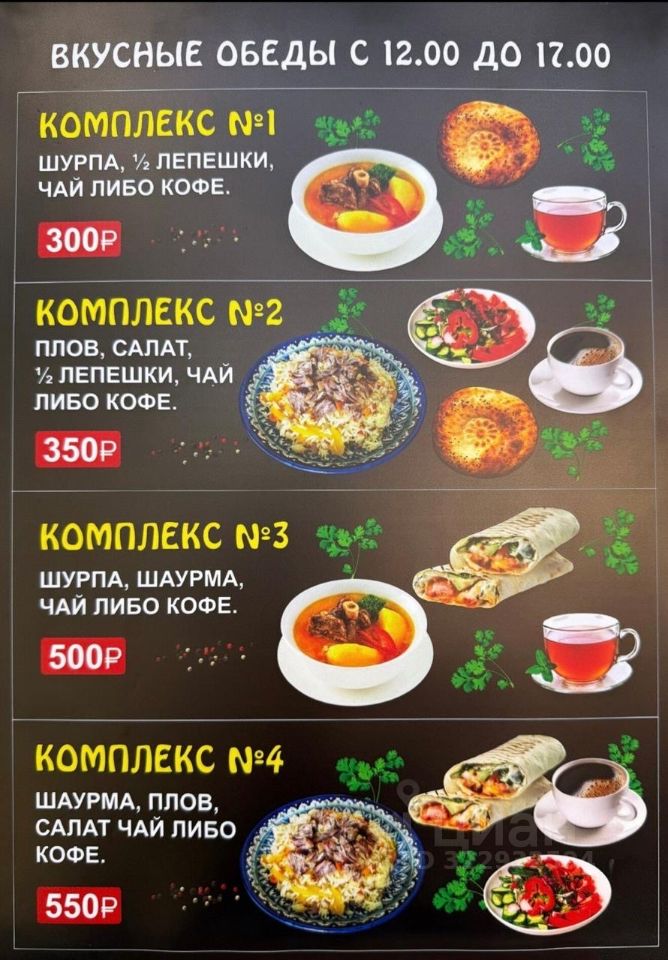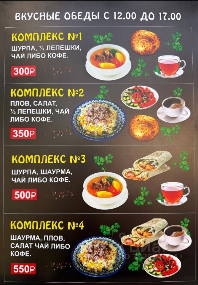 Разнообразное и продуманное меню: - Куриная шаурма - Лаваш, пита, разные национальные вариации - Дополнительные блюда (салаты, плов, шурпа, люля-кебаб, пироги, выпечка, кофе и др.)