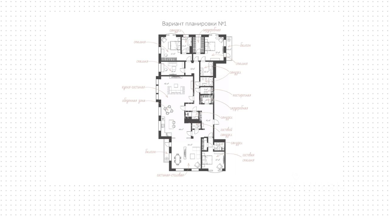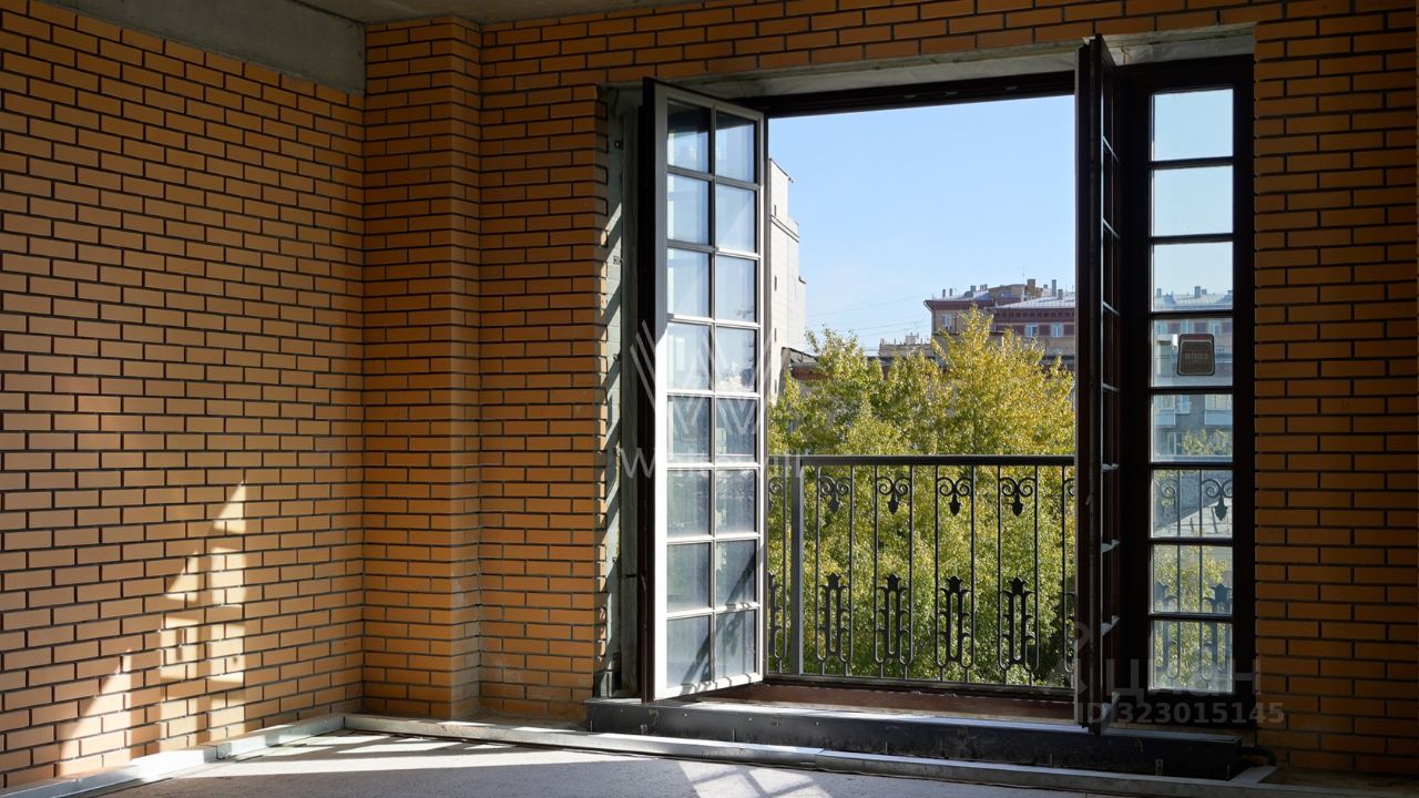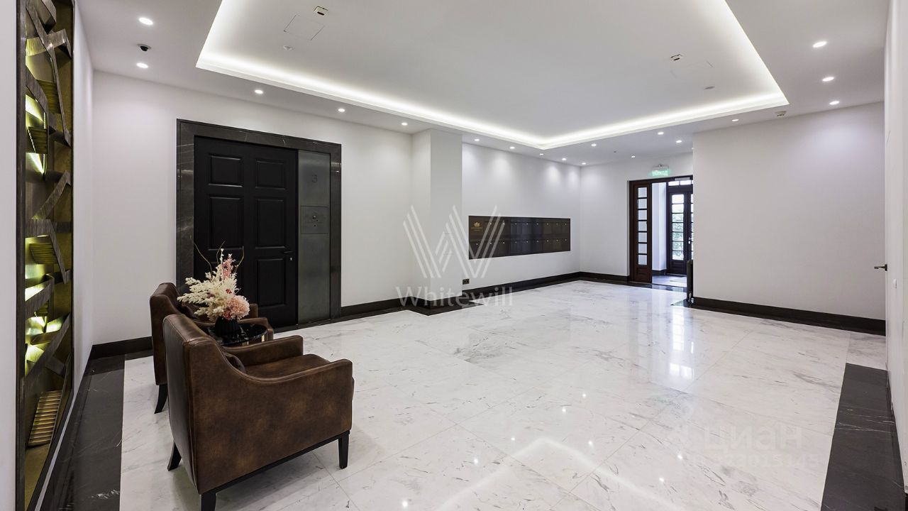 Возможная планировка: гостиная, кухня-столовая, четыре спальни, кабинет, шесть ванных комнат, три гардеробные, постирочная. Благодаря восемнадцати панорамным окнам пространство наполнено естественным светом, открываются виды на три стороны — на город и во внутренний двор.