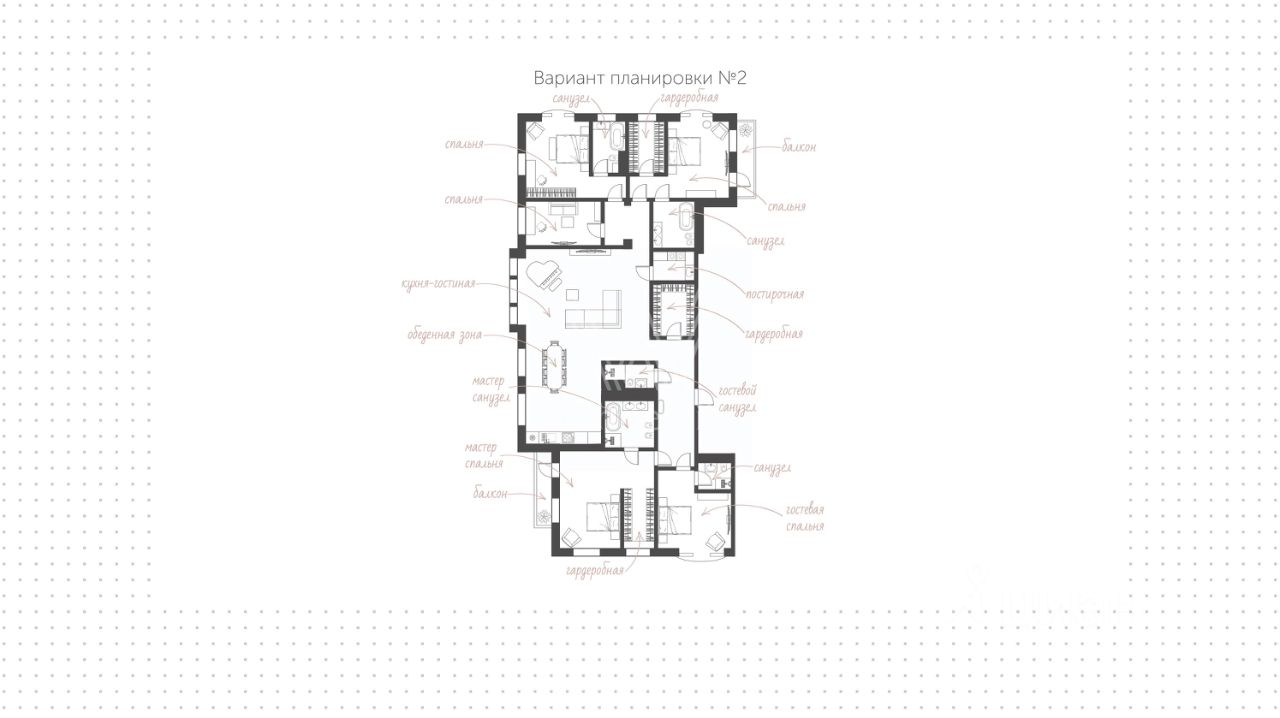 Солнечная квартира со всеми окнами на Юго-Восток, Юго-Запад. Планируется три-пять спален. Два балкона.