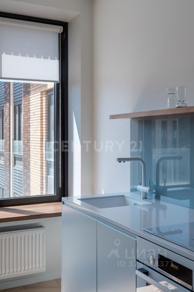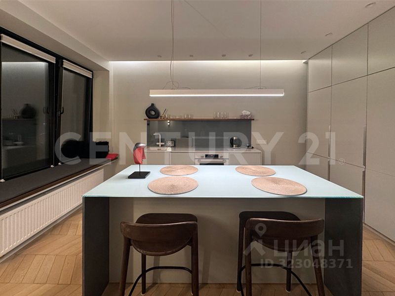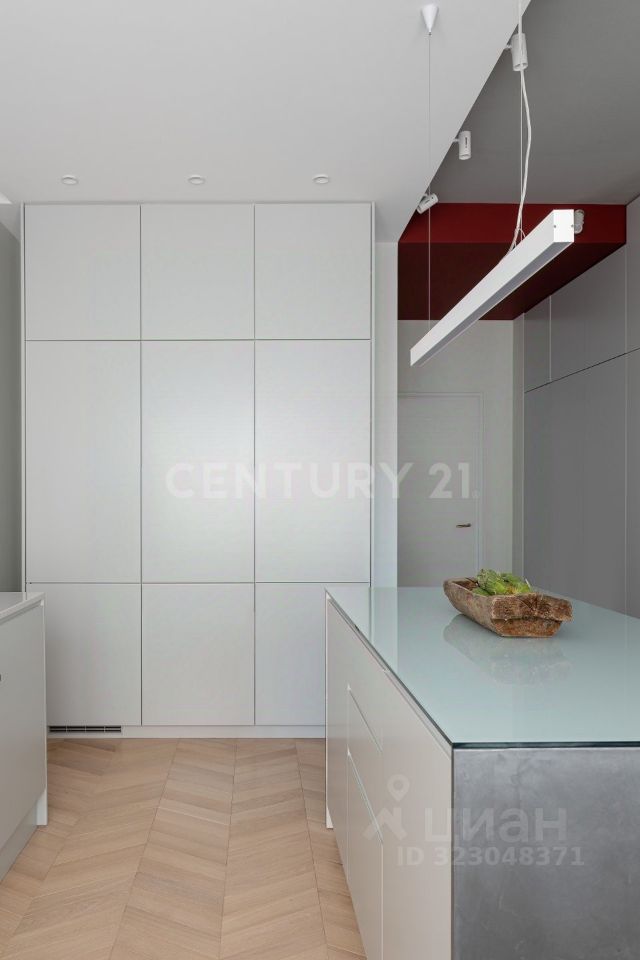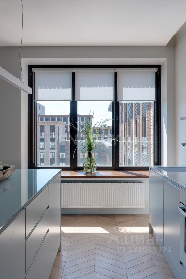 В отделке использовались только качественные, брендовые материалы (полы-паркет, итальянская плитка, бытовая техника Bosch, смеситель Blanco). Корпусная мебель и подоконник изготовлены на заказ по эскизам дизайнера. Несколько сценариев освещения. Рабочая поверхность и кухонный остров имеют одинаковые размеры и расположены друг напротив друга. В нижней части гарнитура находятся встроенные посудомоечная машина, варочная поверхность, духовой шкаф, вытяжка интегрированна в потолок. Полноразмерный холодильник и стиральная машина размещены в высоких пеналах.