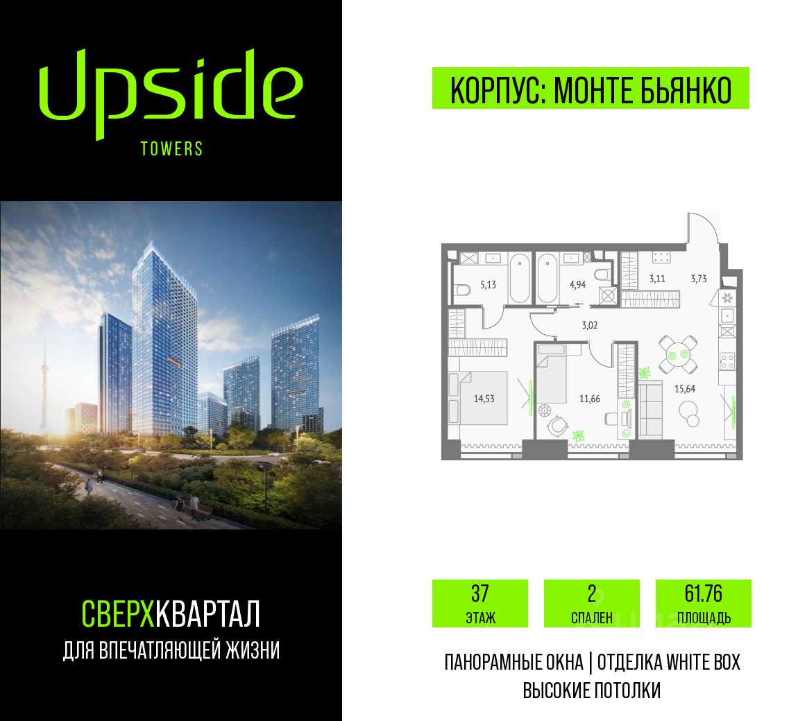 Upside Towers - технологичный квартал строится в динамично развивающемся Бутырском районе, в 3 мин. от метро, в 5 мин. от ТТК. На территории 7 га возводится 5 высотных башен от 19 до 58 этажей, названных в честь главных вершин земли. Квартиры с панорамными окнами в пол, высокими потолками и современными инженерными решениями. Благоустроенная зеленая территория включает: приватные дворы, природный комплекс, прогулочный бульвар, ландшафтный парк 2,5 га с сенсорным садом и многофункциональными игровыми и спортивными площадками.