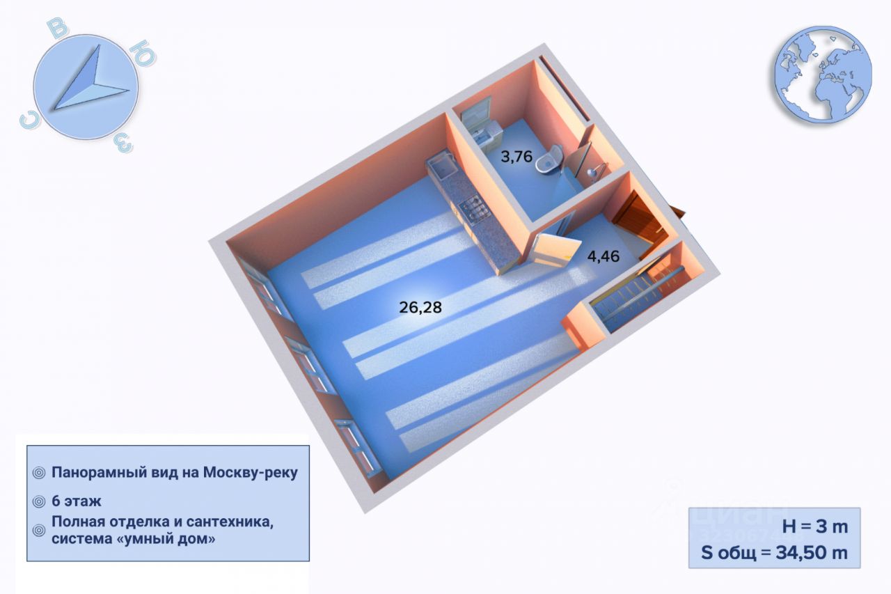 Студия расположена на шестом этаже, проектная площадь — 34,5 кв.м. Пространство организовано удобно: большая комната с кухонной зоной и тремя панорамными окнами, совмещённый санузел площадью 3,76 кв.м., прихожая.