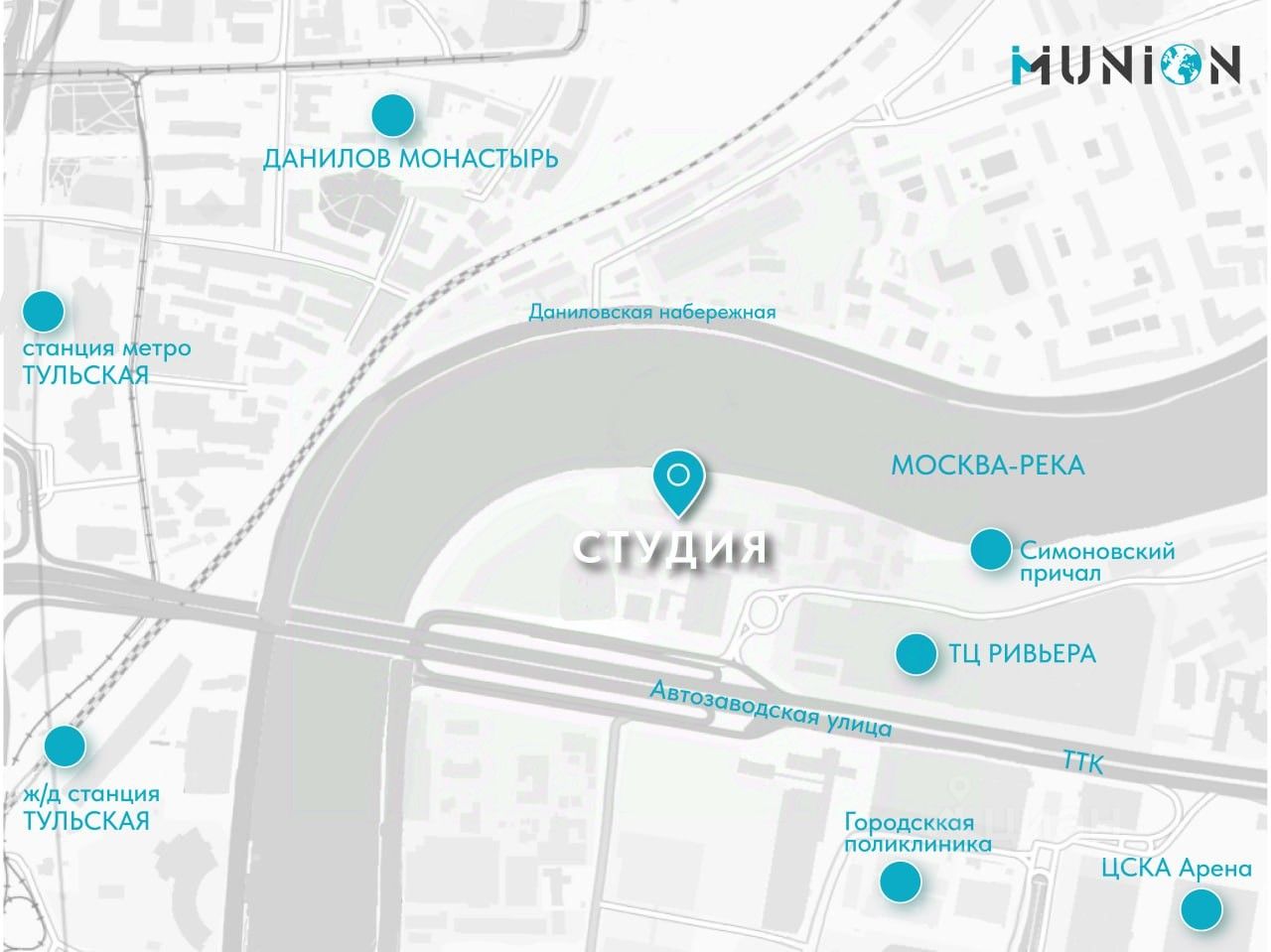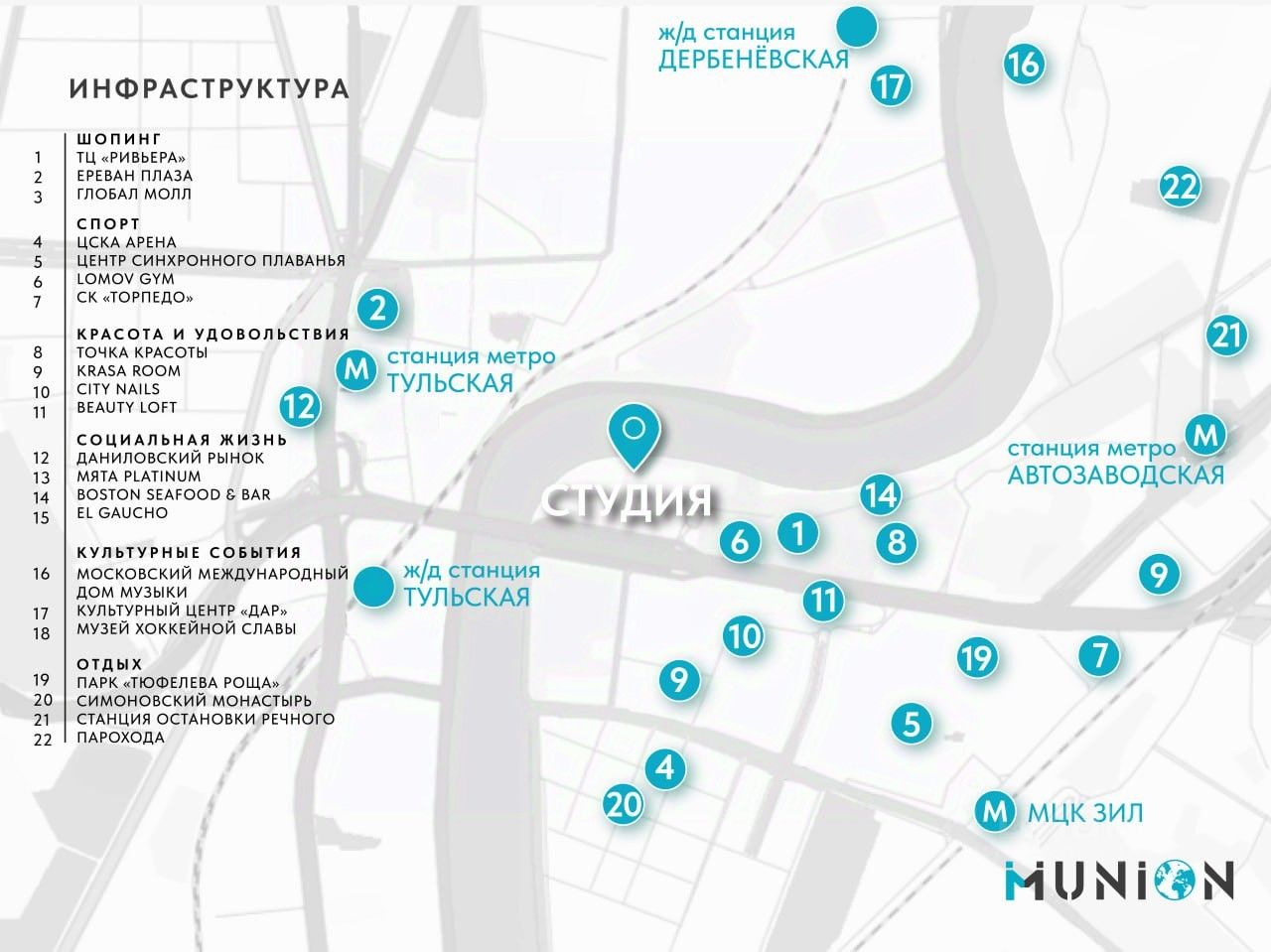 Развитая инфраструктура района делает проживание здесь особенно комфортным. В пяти минутах ходьбы от дома будет оборудован причал — оттуда можно за 15 минут добраться на речном транспорте до парка ''Зарядье''. Поблизости расположены крупные торговые центры ''Ривьера'' и ''Ереван Плаза'', Даниловский рынок, ЦСКА Арена, а также кафе, рестораны, фитнес-клубы и всё необходимое для насыщенной городской жизни.