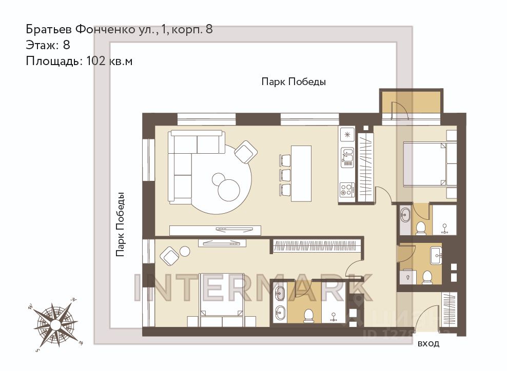 Квартира отличается продуманной и функциональной планировкой: - просторная кухня-гостиная с впечатляющим угловым остеклением в пол, откуда открывается панорамный вид на зеленый массив парка Победы - две мастер-спальни, каждая со своей ванной комнатой, что обеспечивает максимальную приватность для всех членов семьи - холл с гостевым санузлом, постирочная.