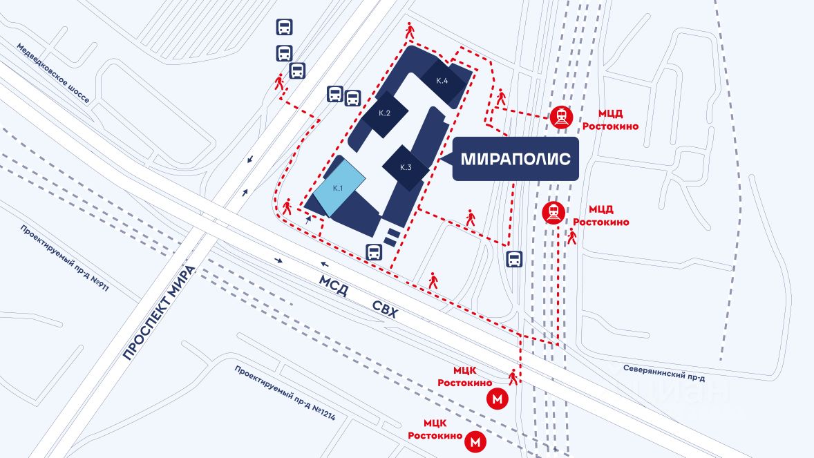 ТРАНСПОРТНАЯ ДОСТУПНОСТЬ. ''Мираполис'' расположен на проспекте Мира — крупной московской магистрали. По ней 8,2 км до Третьего транспортного и 11,5 км до Садового кольца. Рядом с кварталом проходит Московский скоростной диаметр (МСД). Удобная локация в 5 минутах на машине от станции метро ''ВДНХ'', в 400 м от МЦК ''Ростокино'' и быстрый выезд на главные транспортные магистрали позволяет всего за 30 мин. добраться до центра Москвы. Рядом с комплексом останавливается наземный транспорт, который ходит в Медведково и Останкино, до станций метро ''ВДНХ'', ''Красносельская'', ''Сокольники'', ''Преображенская площадь''.