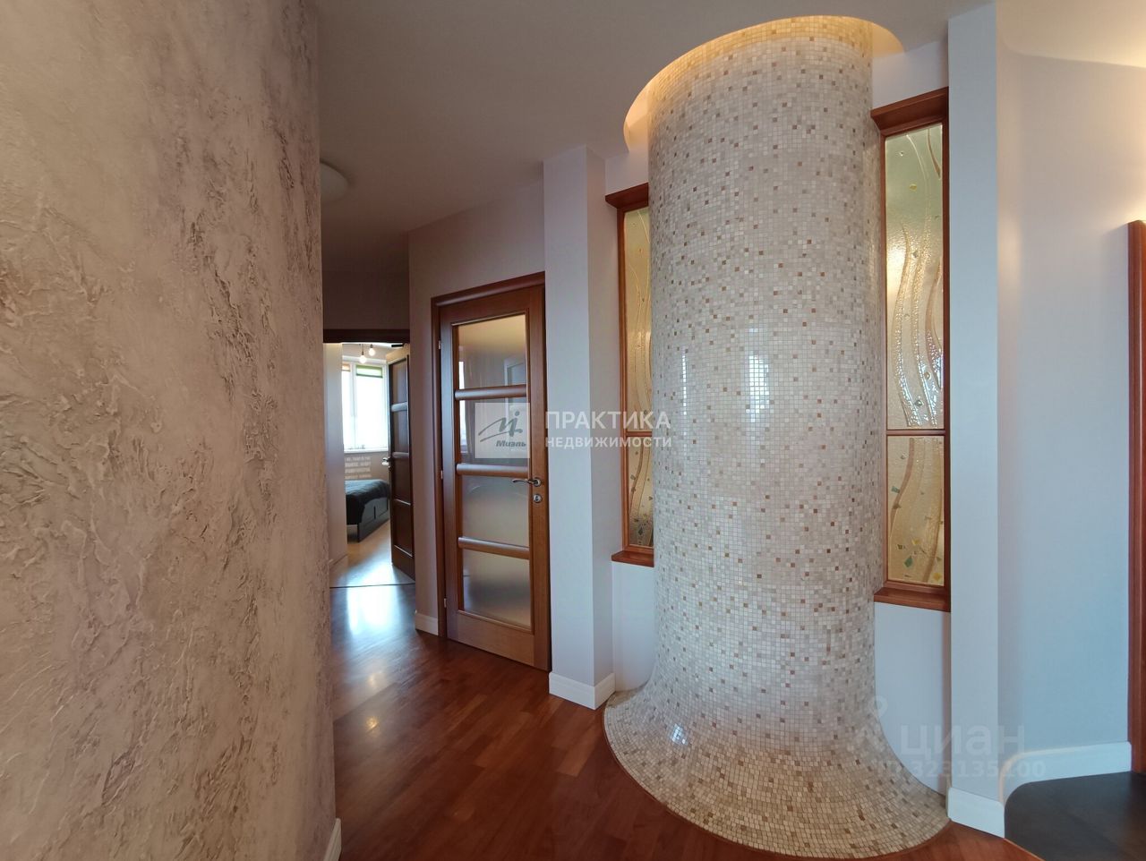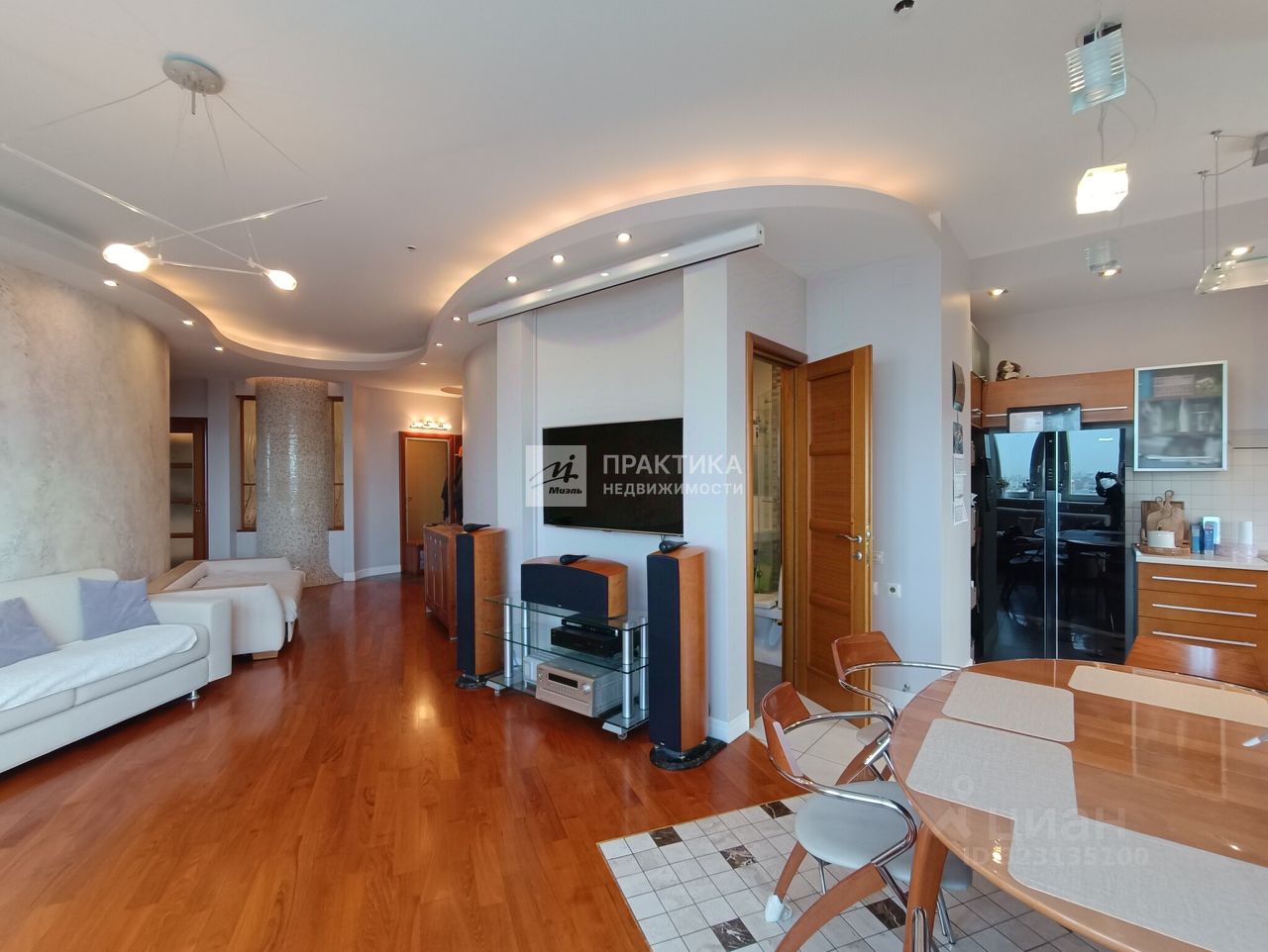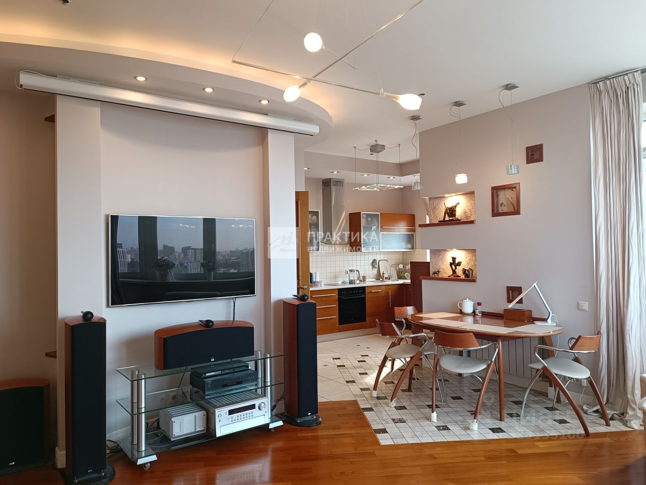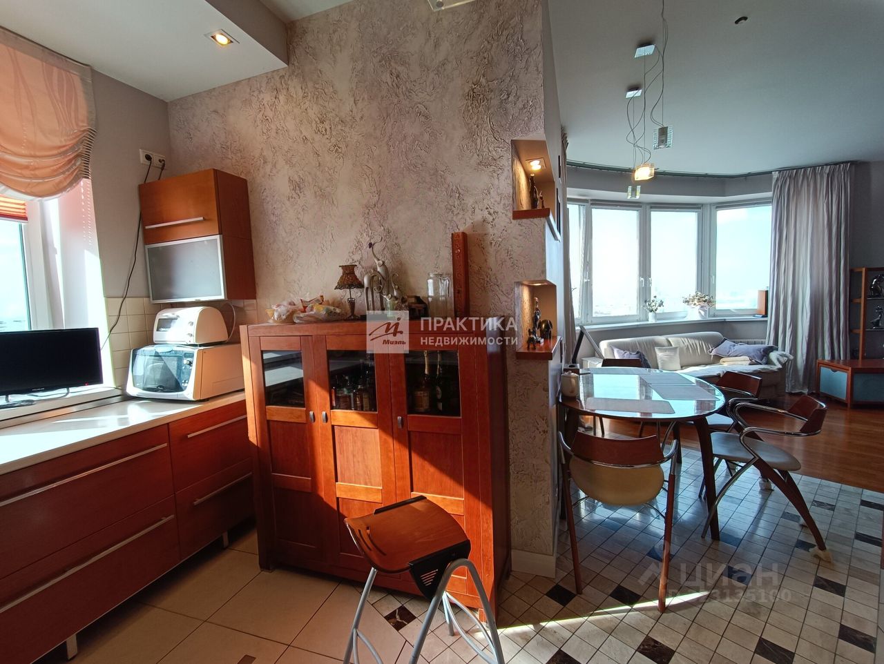 Большая кухня-гостиная (9.9 кв.м.+21.9 кв.м.), 3 изолированных комнаты (14.9+14,7+16.3), 2 совмещённых санузла 8 кв.м. и 2.8 кв.м., в коридоре имеется вместительная гардеробная. В квартире использованы декоративные элементы, витражи, венецианская штукатурка, различные сценарии освещения. Пол - паркет из тика и дуба. Тёплый пол по всей зоне плитки. Из окон открывается шикарный вид на Москву.