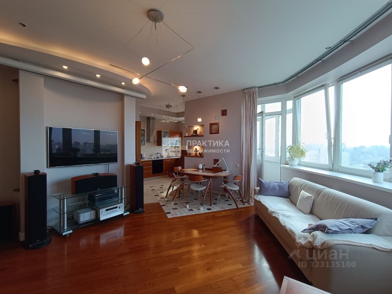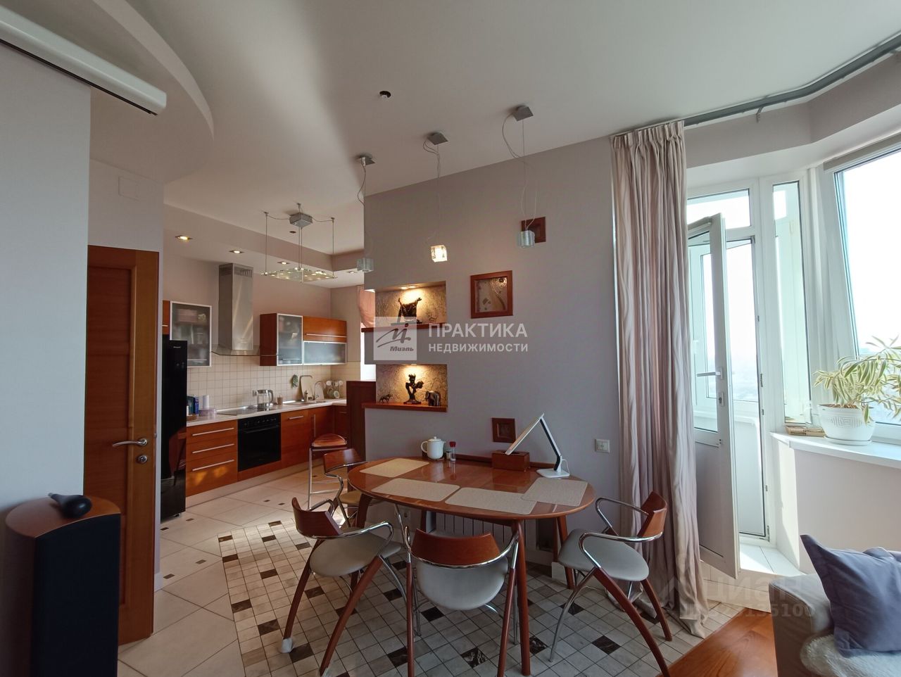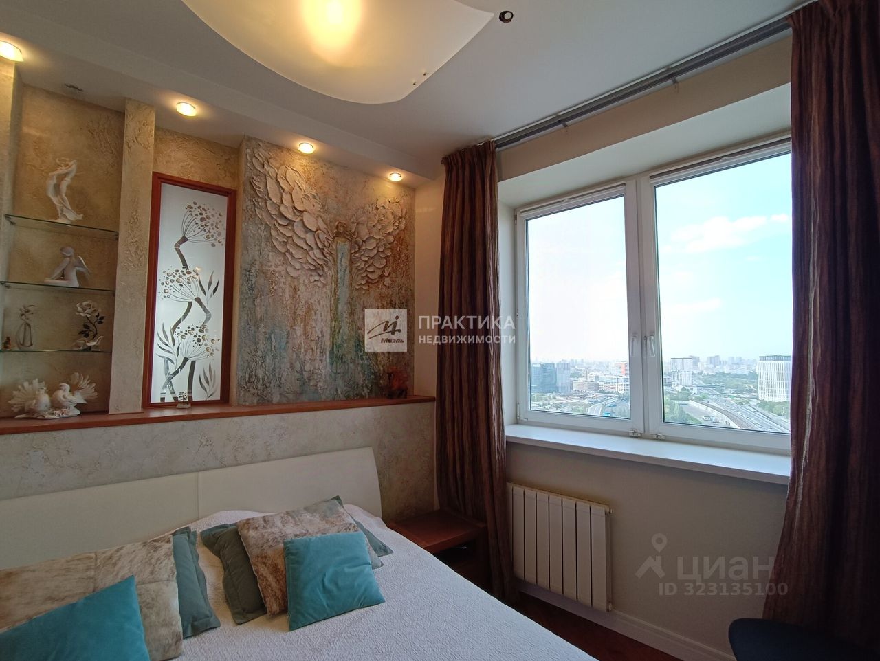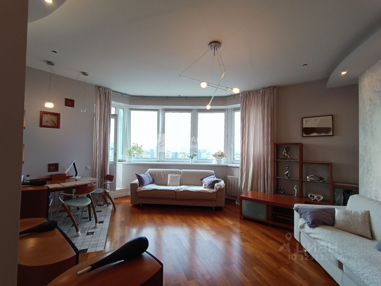 Большая кухня-гостиная (9.9 кв.м.+21.9 кв.м.), 3 изолированных комнаты (14.9+14,7+16.3), 2 совмещённых санузла 8 кв.м. и 2.8 кв.м., в коридоре имеется вместительная гардеробная. В квартире использованы декоративные элементы, витражи, венецианская штукатурка, различные сценарии освещения. Пол - паркет из тика и дуба. Тёплый пол по всей зоне плитки. Из окон открывается шикарный вид на Москву.