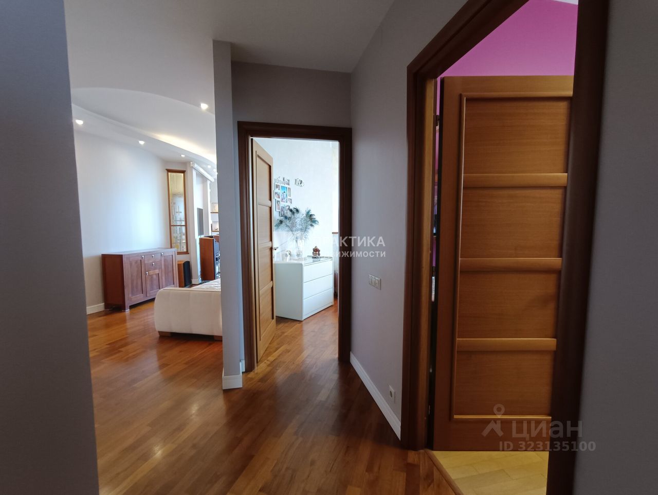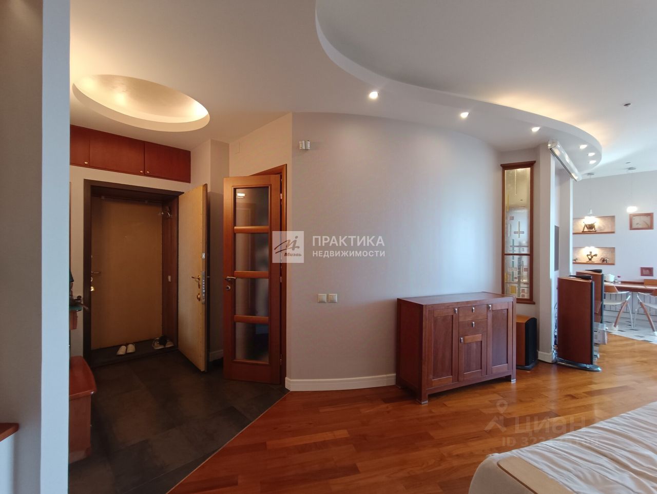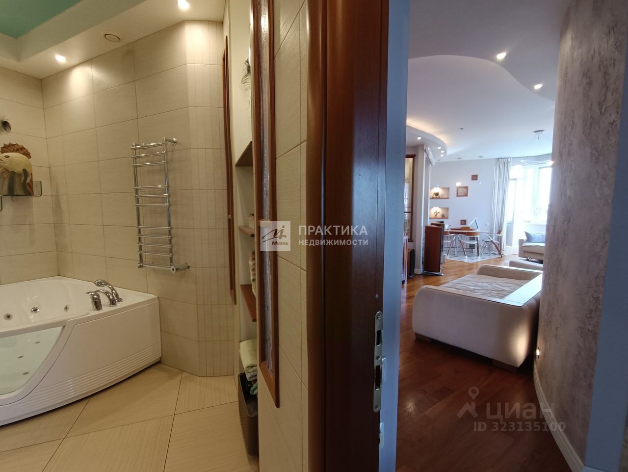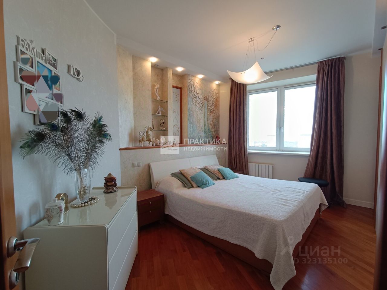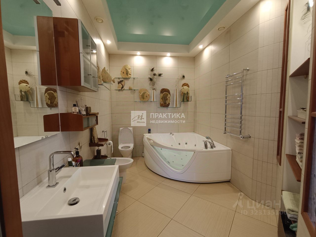 Большая кухня-гостиная (9.9 кв.м.+21.9 кв.м.), 3 изолированных комнаты (14.9+14,7+16.3), 2 совмещённых санузла 8 кв.м. и 2.8 кв.м., в коридоре имеется вместительная гардеробная. В квартире использованы декоративные элементы, витражи, венецианская штукатурка, различные сценарии освещения. Пол - паркет из тика и дуба. Тёплый пол по всей зоне плитки. Из окон открывается шикарный вид на Москву.
