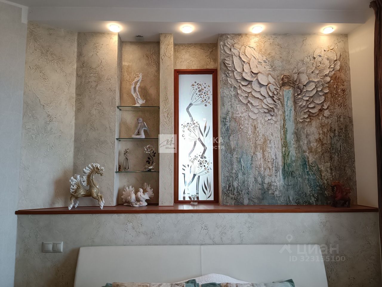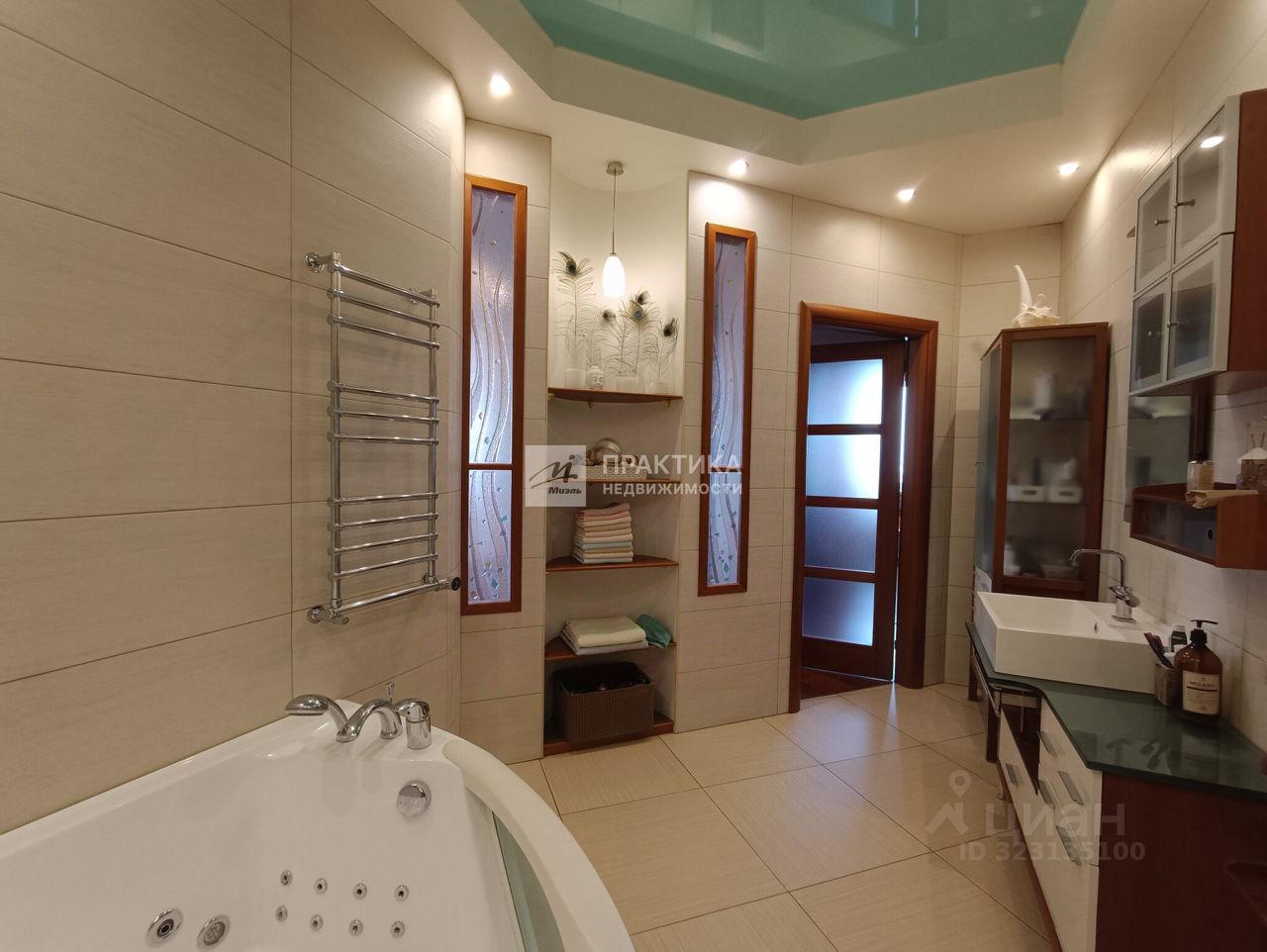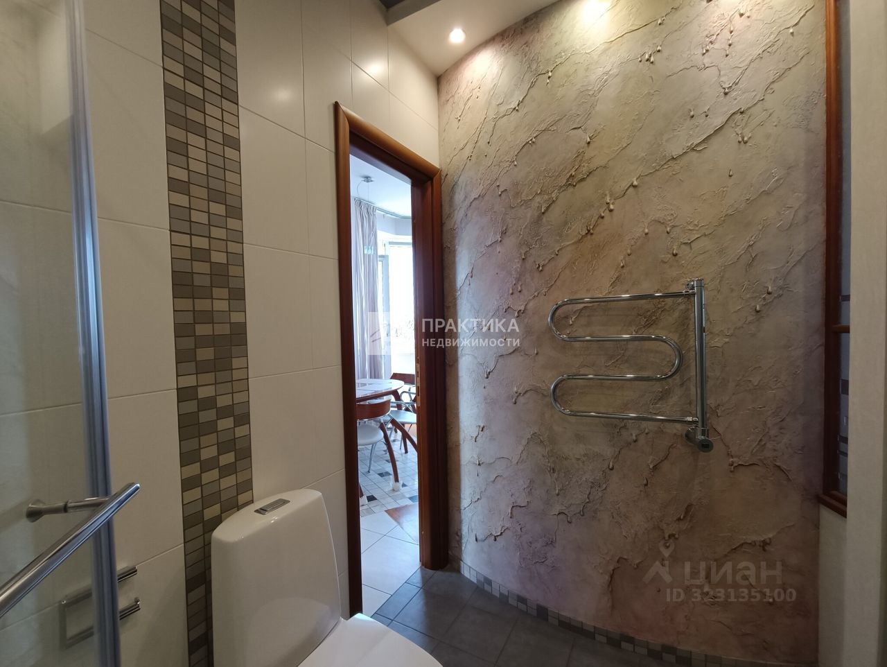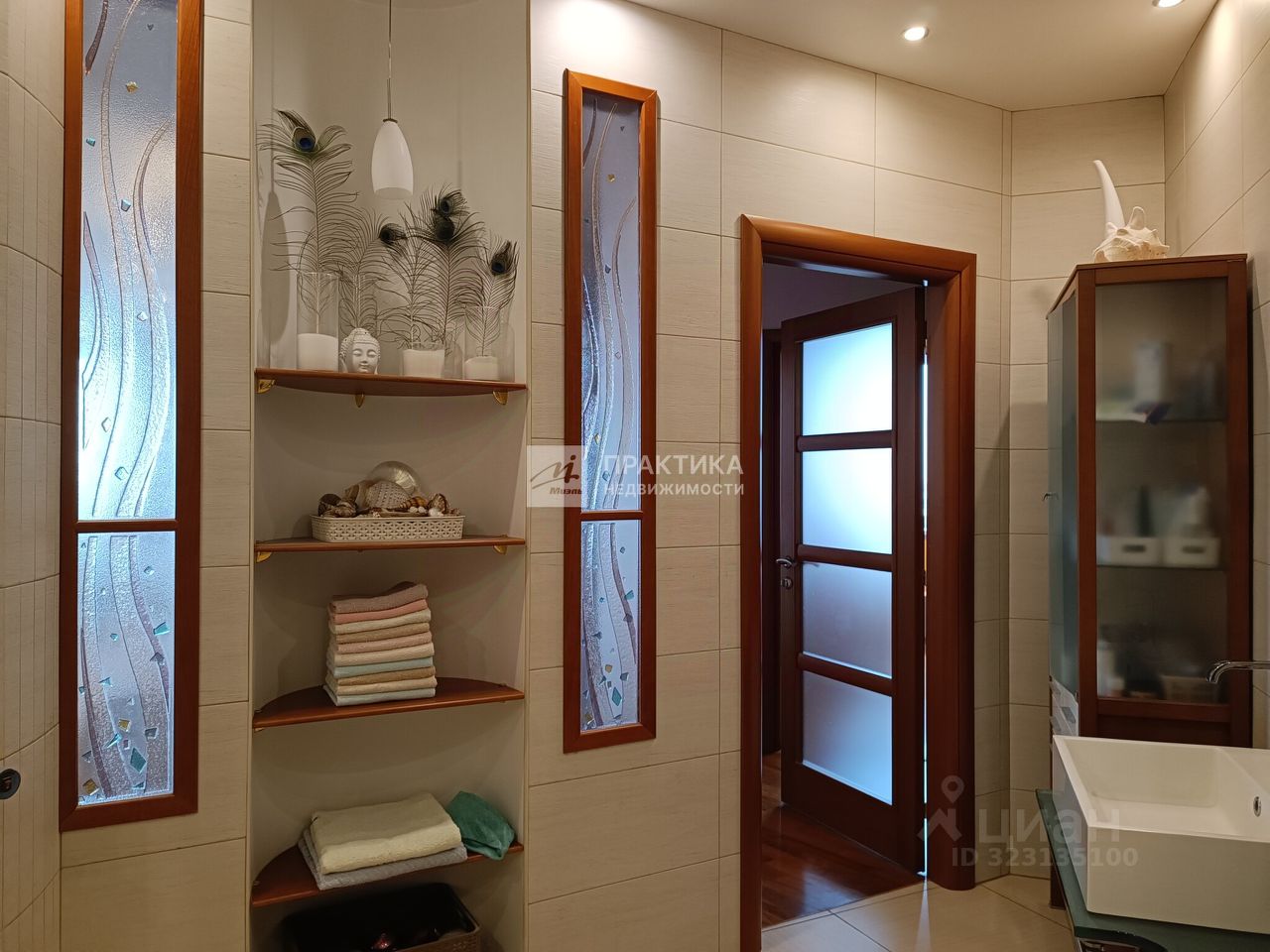 Большая кухня-гостиная (9.9 кв.м.+21.9 кв.м.), 3 изолированных комнаты (14.9+14,7+16.3), 2 совмещённых санузла 8 кв.м. и 2.8 кв.м., в коридоре имеется вместительная гардеробная. В квартире использованы декоративные элементы, витражи, венецианская штукатурка, различные сценарии освещения. Пол - паркет из тика и дуба. Тёплый пол по всей зоне плитки. Из окон открывается шикарный вид на Москву.