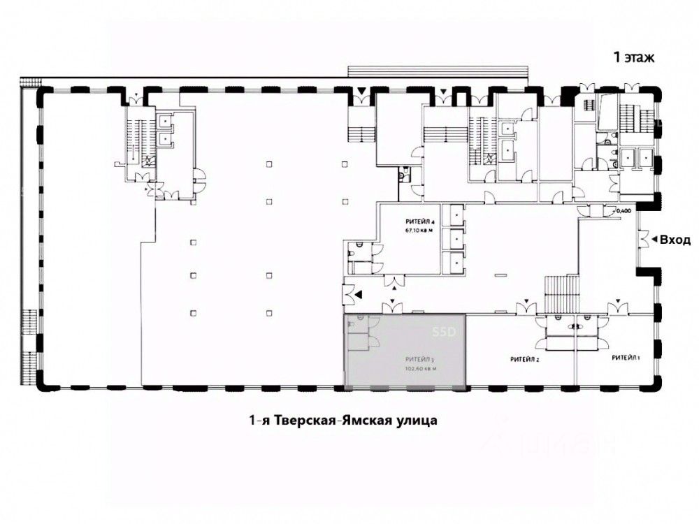 Технические характеристики: 1-й этаж в гостиничном комплексе. Общая площадь 102.6 м², прямоугольной формы. Отдельный вход через лобби. На входе встречает и открывает дверь швейцар. Состояние помещения shell&core. Витринное остекление на Тверскую улицу. Эл. мощность 40 кВт. с возможностью увеличения. Все центральные коммуникации. Система вентиляции - имеется вент. канал.