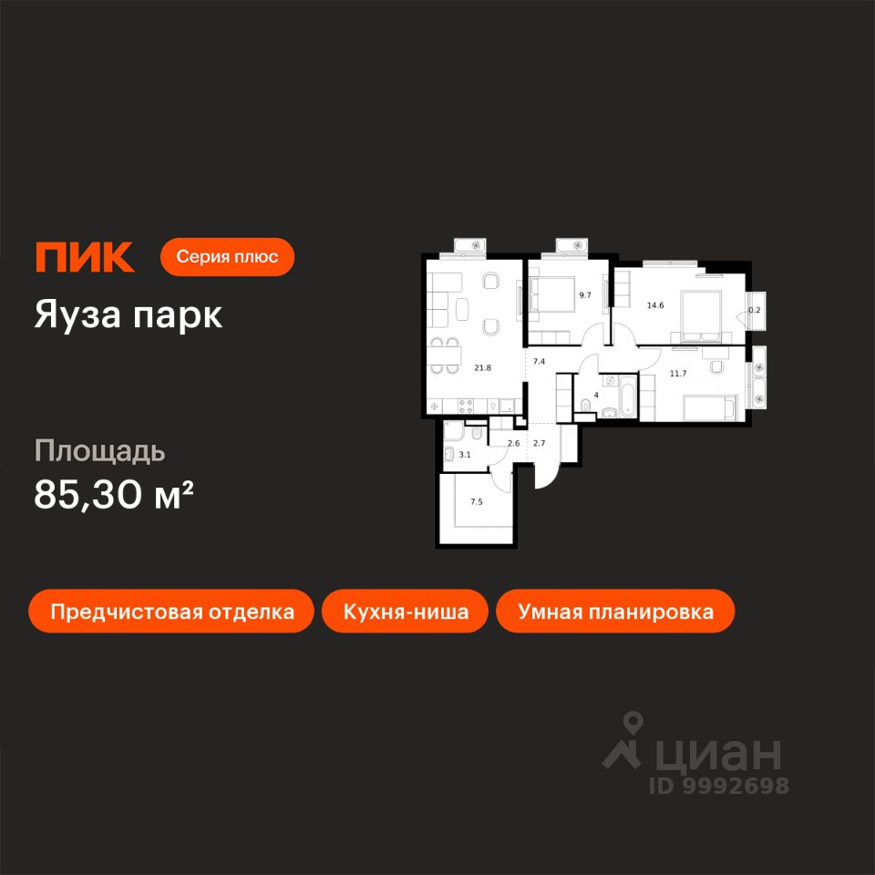 Продаётся 3-комн. квартира площадью 85,3 кв.м на 8 этаже 24 этажного дома (Корпус 12, Секция 1) проекта ПИК Яуза парк. Светлый просторный подъезд на уровне земли, функциональная планировка, большие окна, предчистовая отделка.