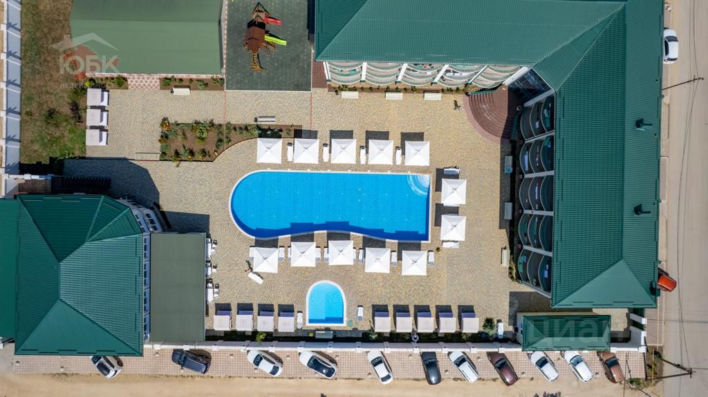 На благоустроенной закрытой территории расположен взрослый и детский бассейны, с современной системой фильтрации, детская площадка, бунгало, шезлонги и зонты.