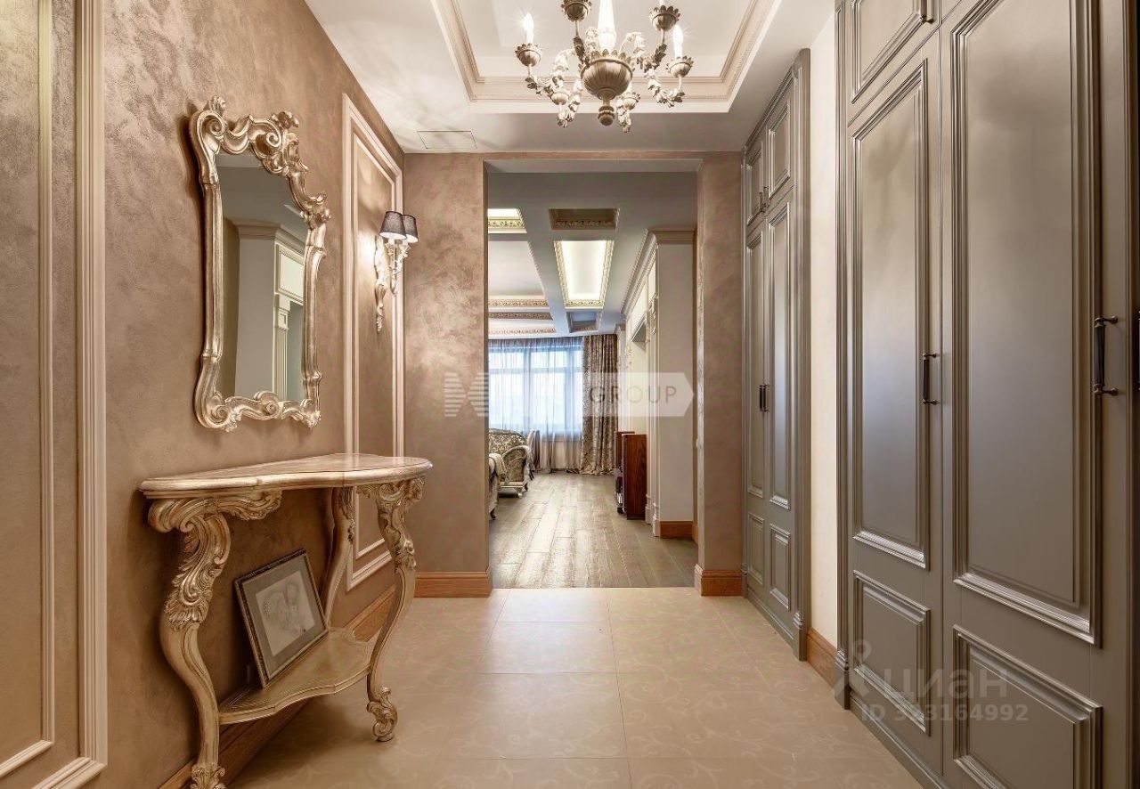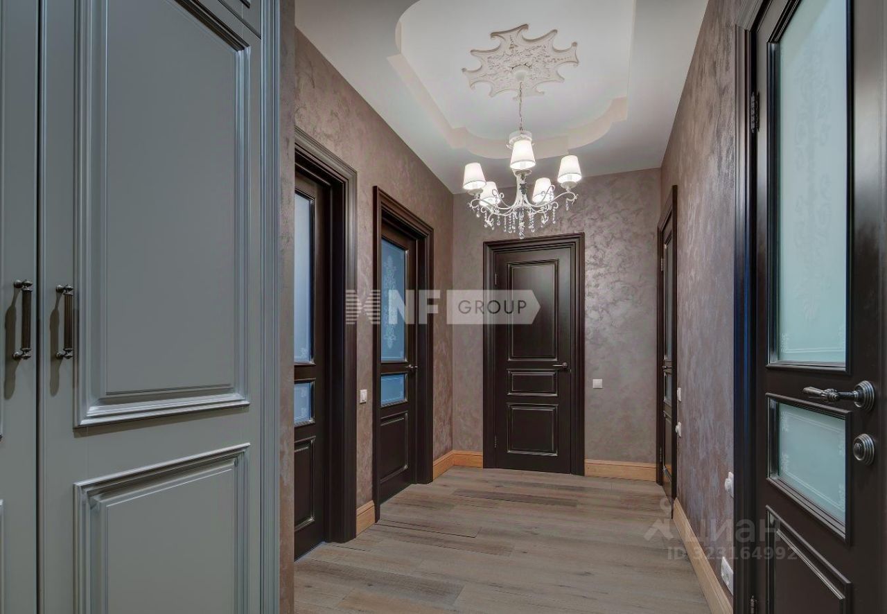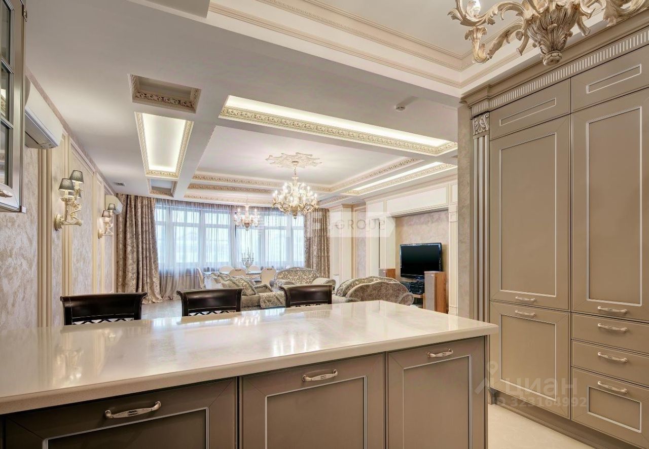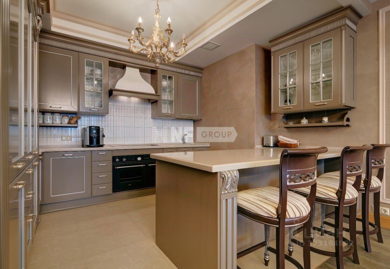 Выполнена отделка в классическом стиле, установлена итальянская кухня Aster и итальянская мебель, бытовая техника Miele и плита Ilve 90 см, сантехника Devon&Devon, люстры фабрики CHELINI.