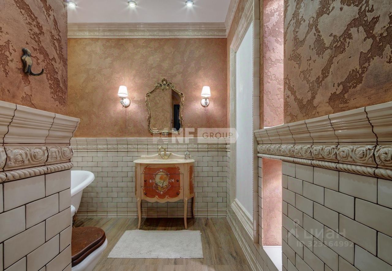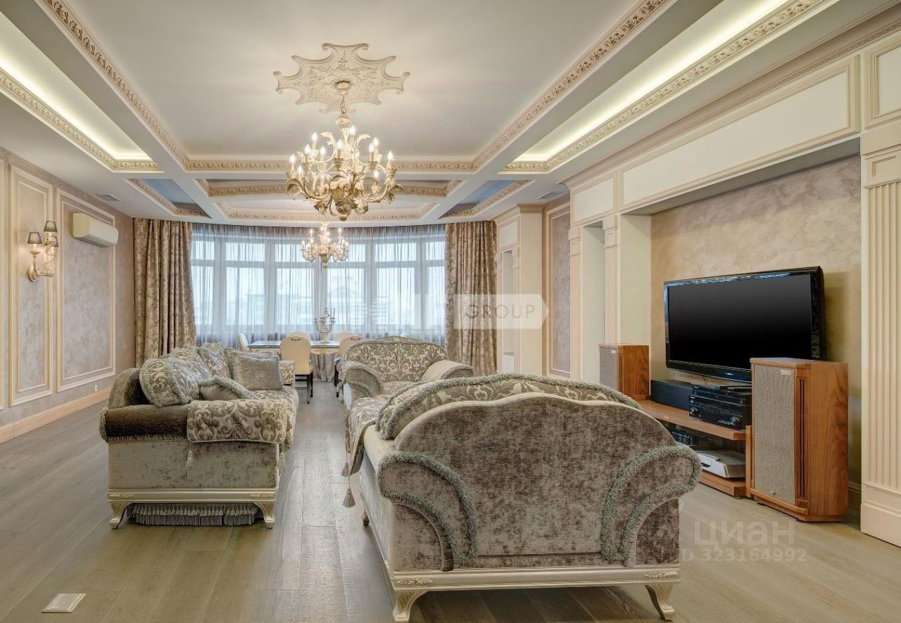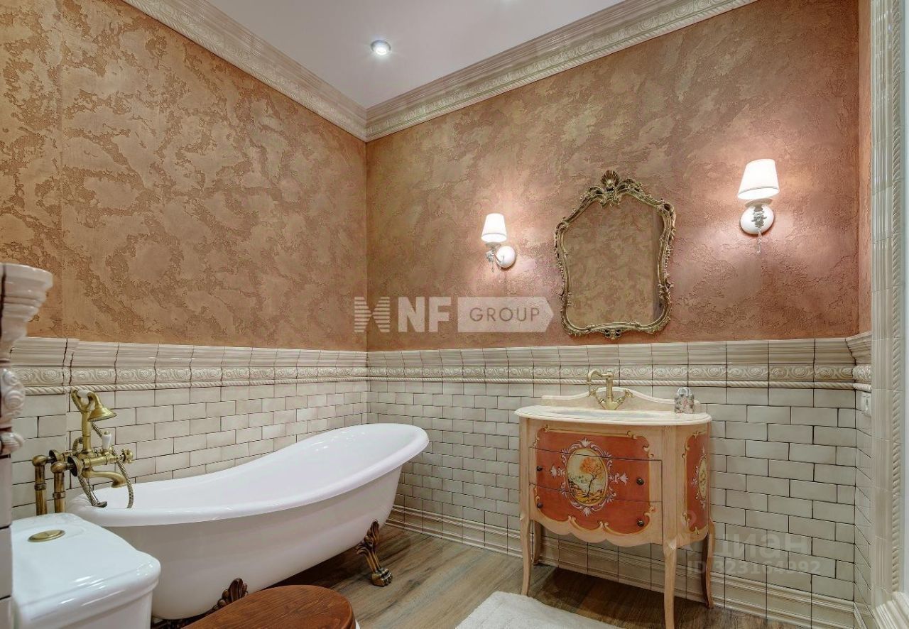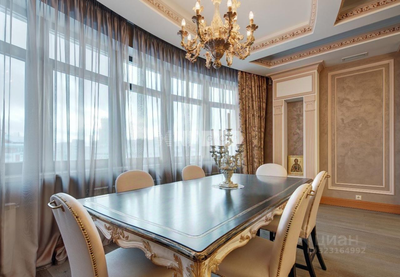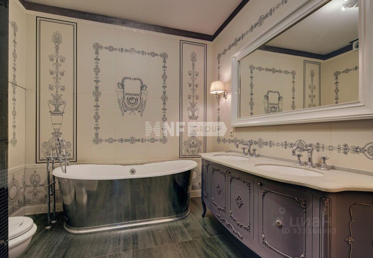 Выполнена отделка в классическом стиле, установлена итальянская кухня Aster и итальянская мебель, бытовая техника Miele и плита Ilve 90 см, сантехника Devon&Devon, люстры фабрики CHELINI.