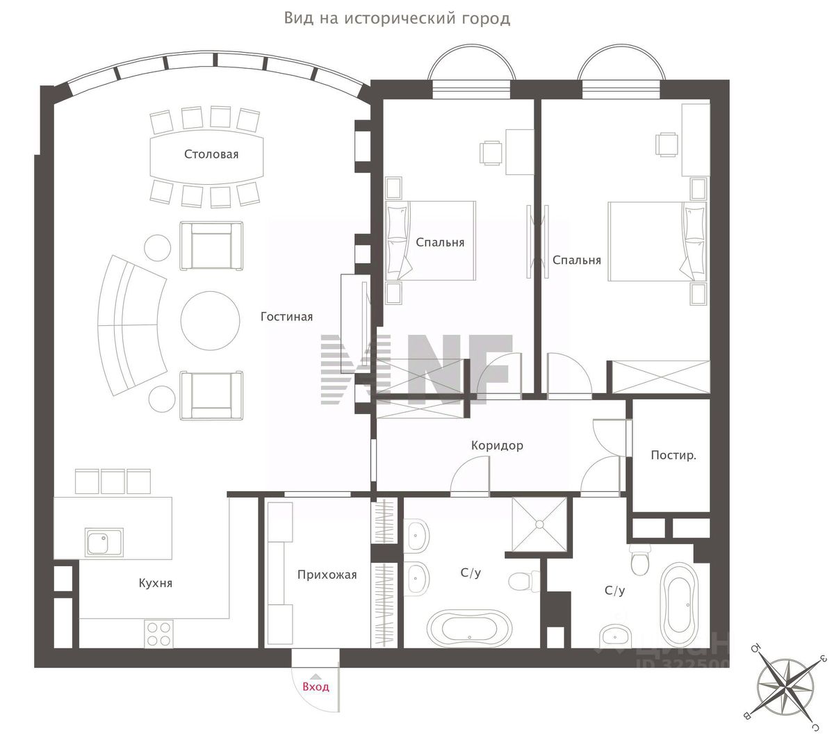 Планировка: гостиная-столовая, две спальни с ванными комнатами, постирочная.