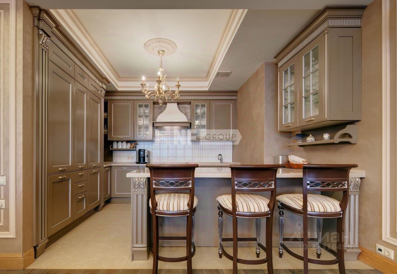 Выполнена отделка в классическом стиле, установлена итальянская кухня Aster и итальянская мебель, бытовая техника Miele и плита Ilve 90 см, сантехника Devon&Devon, люстры фабрики CHELINI.