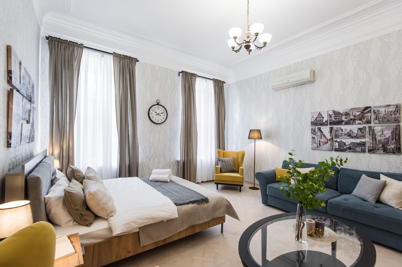 Просторная квартира в центре Москвы! Квартира порадует Вас дизайнерским интерьером, широкоформатными окнами и доступностью к главным достопримечательностям столицы. В комнатах установлены кондиционеры, ЖК телевизо в гостиной. Кухня полностью оборудована бытовой техникой: холодильником, микроволновой печью, электрическим чайником, варочной панелью, духовым шкафом. Нашим гостям доступна парковка (за дополнительную плату). В 3 минутах находятся три станции метро (Пушкинская, Тверская, Чеховская). Рядом расположены Новопушкинский сквер и площадь ''Петровские ворота''. В соседнем доме находится Московский академический музыкальный театр.