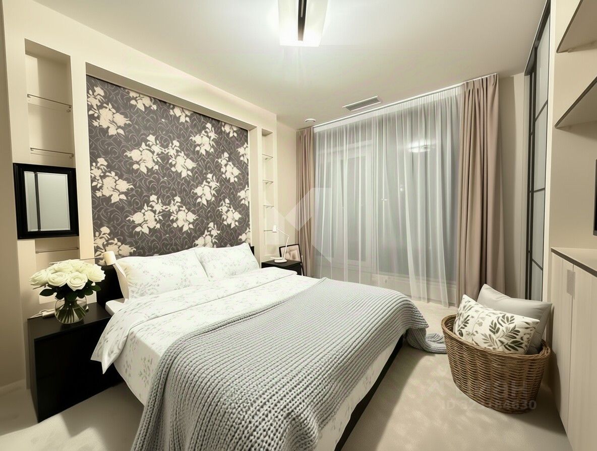 Квартира включает две уютные спальни, одна из которых оборудована двуспальной кроватью и встроенными шкафами. Дополнительно предусмотрены гардеробная, два санузла и постирочная с стиральной и сушильной машинами, что обеспечивает максимальный комфорт для жильцов.