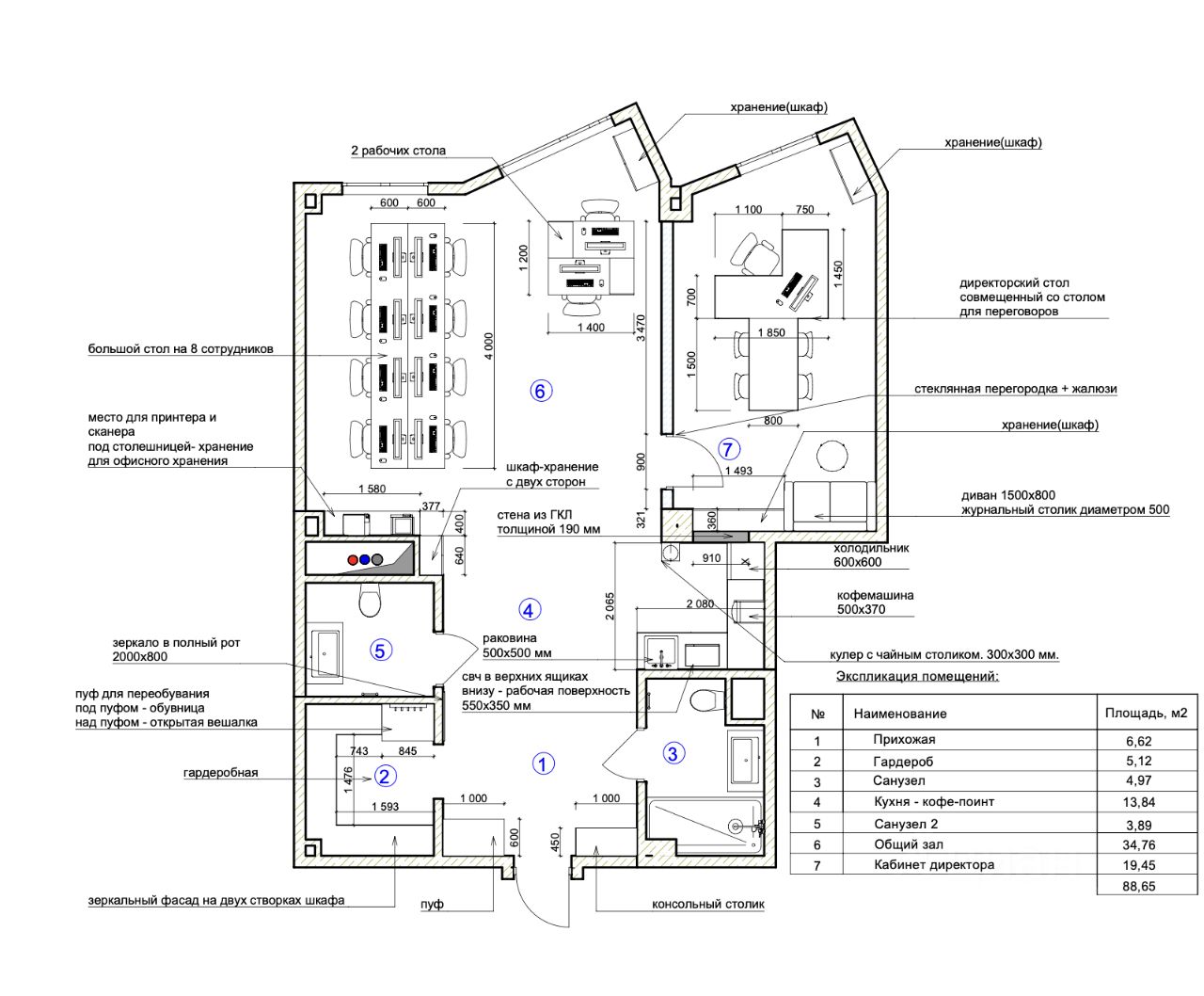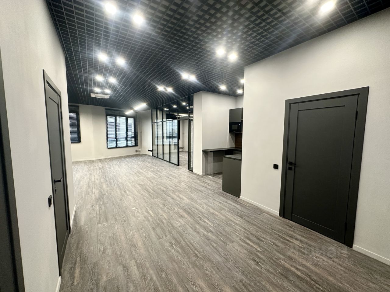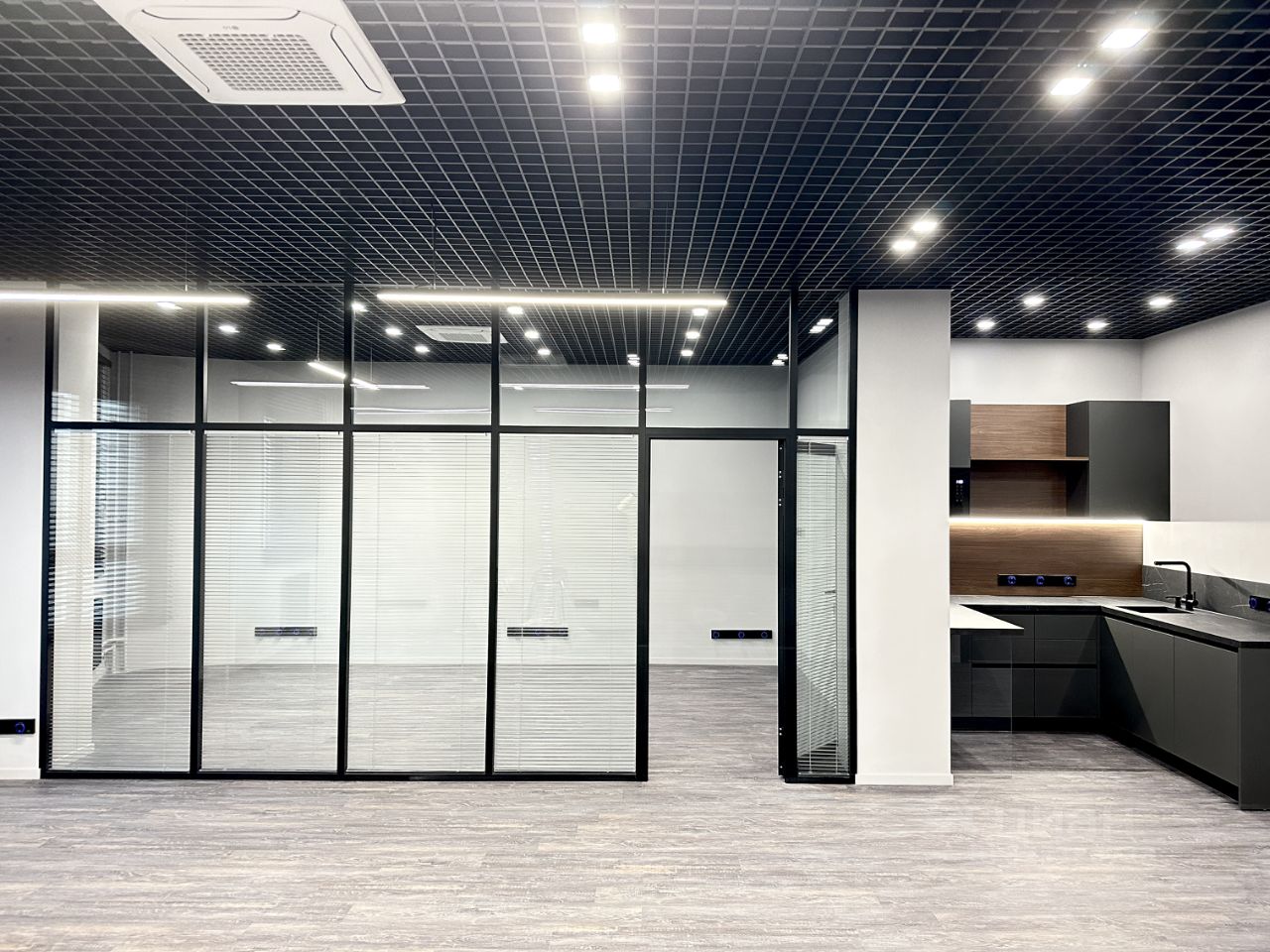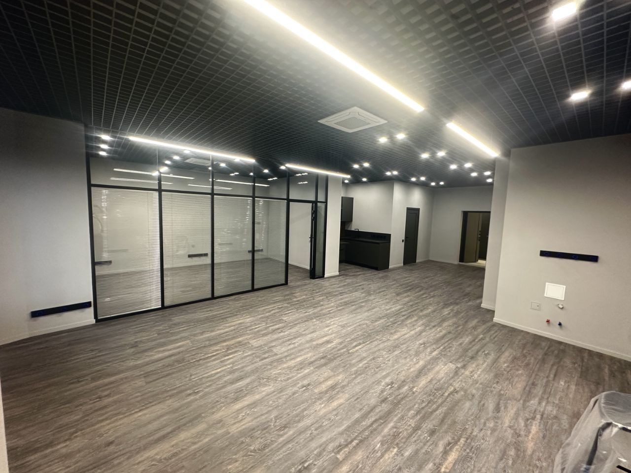 Планировка и оснащение: - Open space + изолированный кабинет руководителя или переговорная комната со стеклянными перегородками и встроенными жалюзи. В помещении с запасом смонтированы розетки, в кабинете установлен ТВ и диван. - Оборудованная кухня (раковина, барная стойка, посудомоечная машина, микроволновая печь) - 2 сан.
