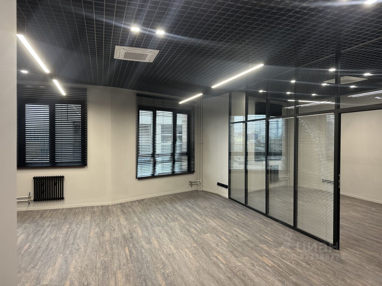 Планировка и оснащение: - Open space + изолированный кабинет руководителя или переговорная комната со стеклянными перегородками и встроенными жалюзи. В помещении с запасом смонтированы розетки, в кабинете установлен ТВ и диван. - Оборудованная кухня (раковина, барная стойка, посудомоечная машина, микроволновая печь) - 2 сан. узла (один с душевой) - Гардеробная комната с установленной системой хранения и зеркалом - Новые системы кондиционирования и пожарной сигнализации - Круглосуточный доступ 24/7