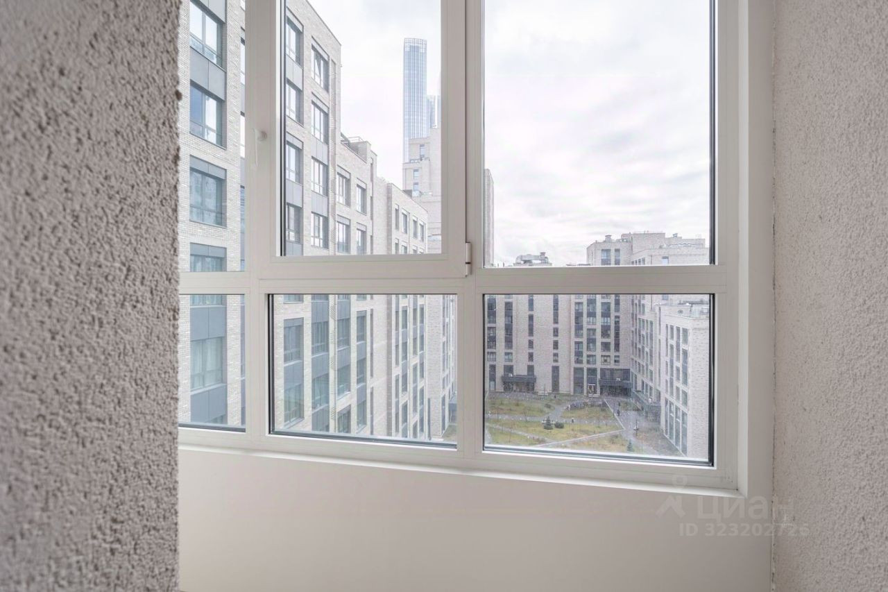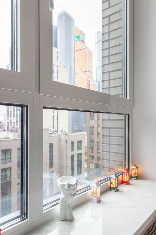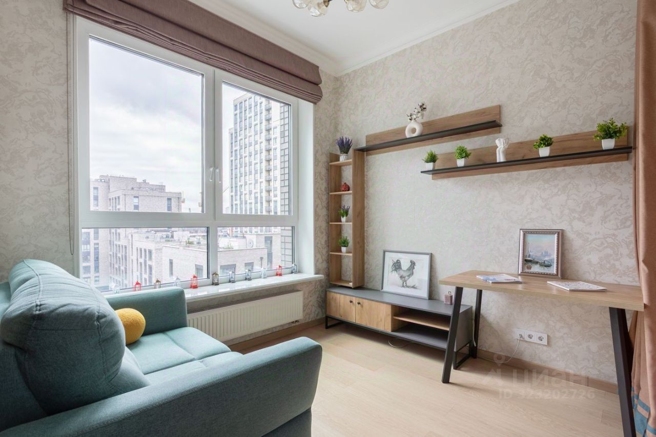 Уютная гостиная зона с большим окном и лоджией - виды на зеленый тихий двор и на башни соседнего ЖК Capital Towers