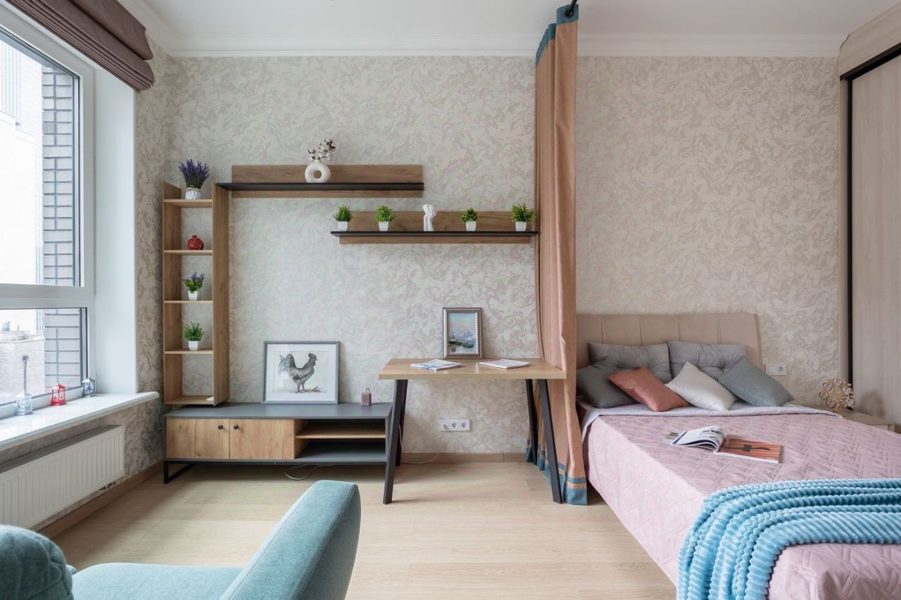 Закрытая спальная зона со встроенным шкафом - решение для тех, кто ценит приватность и порядок. Кровать с ортопедическим матрасом, встроенный шкаф, мягкий свет, создающий атмосферу уюта.