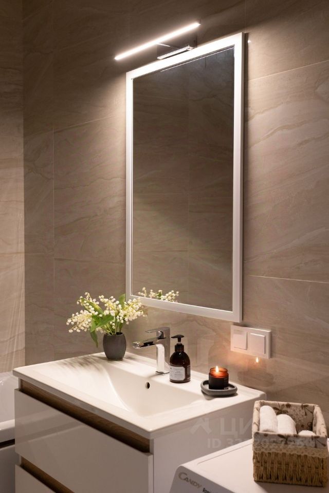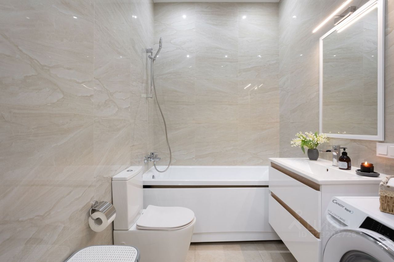 Ванная комната так же оборудована всем необходимым — стиральная машина, зона хранения.