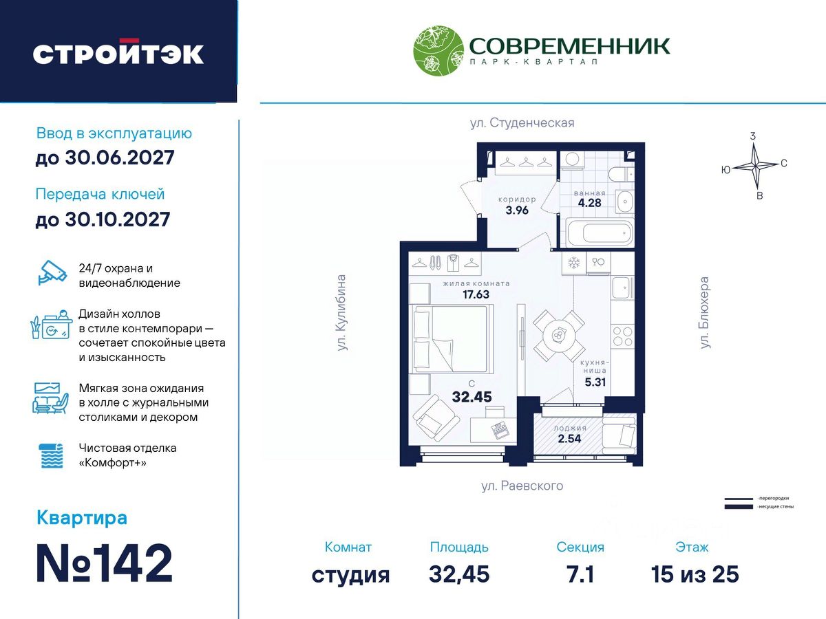 Время жить счастливо Современник — знаковый парк-квартал в интеллигентном районе Втузгородок, откуда недалеко до центра, а вблизи ведущие вузы и театры. Квартал состоит из 8 очередей строительства. Шесть очередей уже сданы и заселены, седьмая строится. В продаже квартиры от застройщика: 1 этап седьмой очереди. Объединяет квартал большой внутренний парк площадью в гектар — богатый прогулочными маршрутами, тенистыми деревьями, пространствами для отдыха, спорта и детских игр. С внешней стороны, у домов седьмой очереди, появится гостевой центр. Проект создавали в KCAP Architects and Planners, архитектурном бюро из Нидерландов, чьи работы украшают ландшафты Гамбурга, Антверпена и других городов Европы. Технологии, продуманное пространство и трендовый облик зданий создают размеренную атмосферу для жизни здесь. Достойное окружение До проспекта Ленина на машине вы доберётесь за 10 минут, а с другой стороны, неподалёку — Шарташский лесопарк с озером Шарташ, которому около миллиона лет. Здесь для вас пляжи, лодочные станции, тропы для бега и кафе. В квартале уже работают супермаркеты, пекарни, салон красоты и не только. Ближние школы, гимназии и университеты помогут расправить крылья новым поколениям, а детские сады станут заботливой средой в начале пути. Кстати, на территории квартала спроектирован муниципальный детский сад на 200 мест. Выходите во двор Гуляйте по зелёным аллеям или устройтесь с книгой в гамаке. Займитесь воркаутом, футболом, баскетболом или пинг-понгом. Проводите семейные праздники под крытым амфитеатром или отправьте детей играть на насыщенный плейхаб. Мы всё предусмотрели. На закрытой территории без машин и посторонних спокойно и безопасно. Видеонаблюдение и освещение добавляют ещё больше уверенности. Впечатляющая доминанта у домов 7 очереди — новый гостевой центр: камерное пространство под навесом-перголой с озеленением и скамейками, чтобы встречать друзей. Ваша зона комфорта Стильное лобби Современника мы выполним в эстетике contemporary: минимализм, сочетание дерева со штукатуркой и тёмным металлом, зеркала, витражи. Обстановка из мягкой мебели, растений и книг. Двери из холла выходят на обе стороны. Внутри — комната для колясок и самокатов. На -1 этаже подземный паркинг с 201 машино-местом, куда легко попасть на лифте прямо с вашего этажа. Здесь же можно приобрести одну из 67 кладовых, чтобы хранить сезонный инвентарь. СТРОЙТЭК возводит 7 очередь в 3 этапа. Дом с привилегиями Первый этап — секция 7.1, башня в 25 этажей. Здесь 246 квартир в 19 уникальных планировках от студий до 3-комнатных, в классических и евро-вариантах. Просторные кухни-гостиные, гардеробные и окна на 2 стороны — лишь часть их плюсов. В Современнике улучшенный стандарт отделки ''Комфорт +''. Помимо комфортных сантехники и электрики, в него входят оконные стёкла Energy Light, которые помогают сохранять температуру, прочный ламинат 33 класса и устойчивые к многократной покраске виниловые обои. Белые межкомнатные двери и плинтусы подчеркнут любую цветовую гамму.