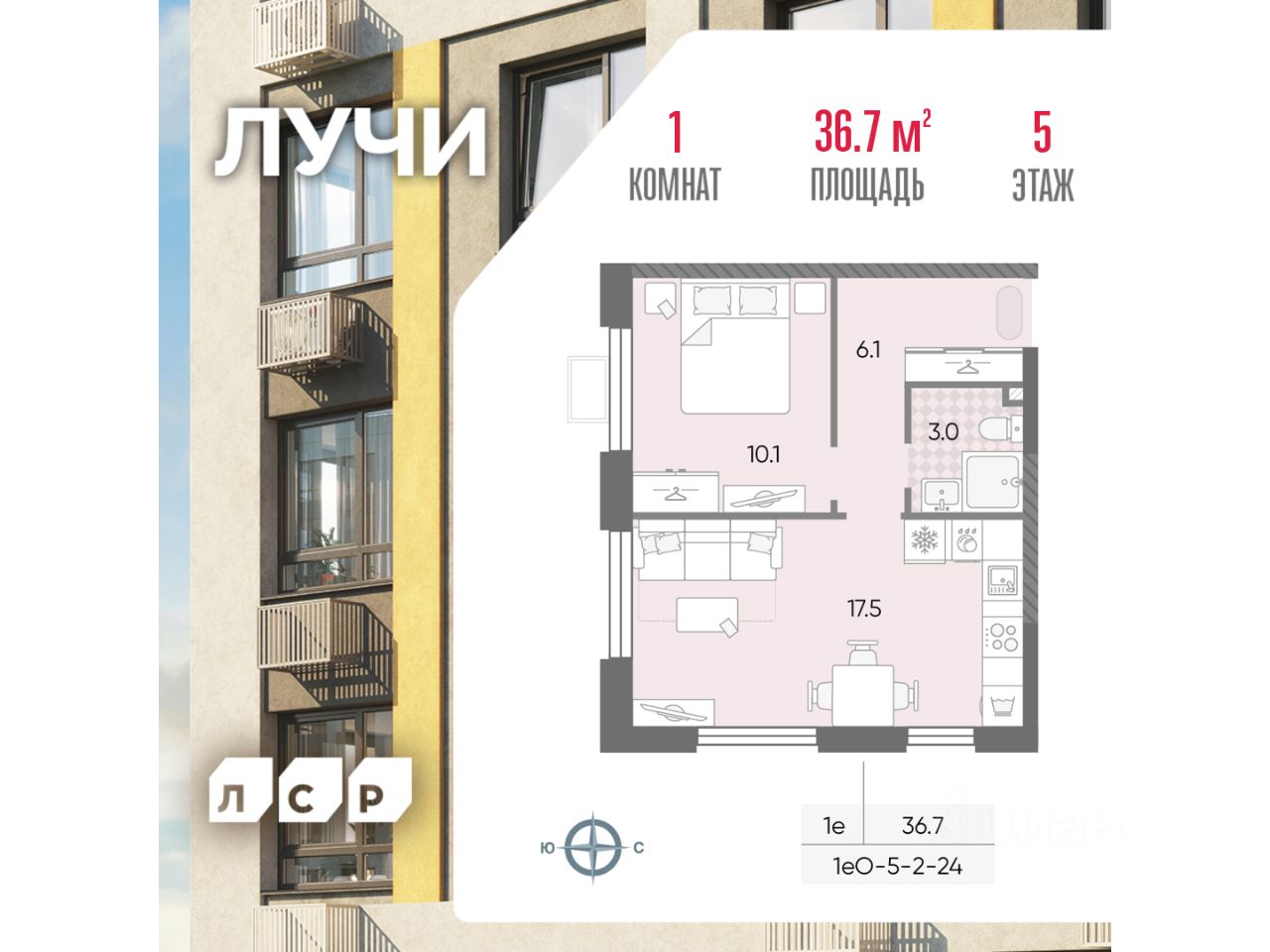Продается 1-комнатная квартира общей площадью 36.7 кв. метров на 5 этаже жилого комплекса Лучи.