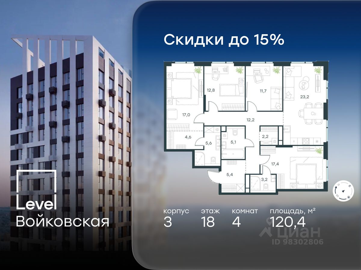 Продается 4-комнатная квартира площадью 120.40 кв. м без отделки. Квартира находится на 18 этаже 20-этажного корпуса 3, в новом жилом комплексе бизнес-класса Level Войковская, расположенном рядом с живописным заповедником ''Покровское-Стрешнево'' (застройщик - компания Level Group/Левел групп).