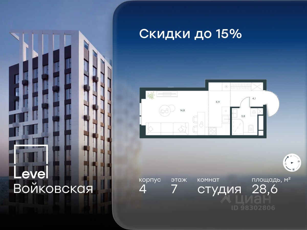 Продается студия площадью 28.60 кв. м с отделкой. Квартира находится на 7 этаже 26-этажного корпуса 4, в новом жилом комплексе бизнес-класса Level Войковская, расположенном рядом с живописным заповедником ''Покровское-Стрешнево'' (застройщик - компания Level Group/Левел групп).