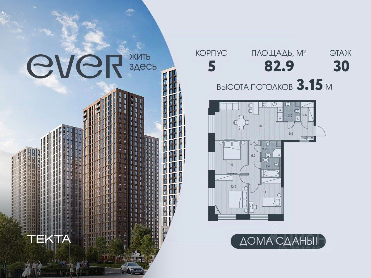 4-комн. квартира в ЖК ''Ever'' на 30 этаже в 34 этажном здании Корпус 5. Общая площадь: 82.9 кв.м., жилая: 52.3 кв.м. Высота потолков 3.15 м.