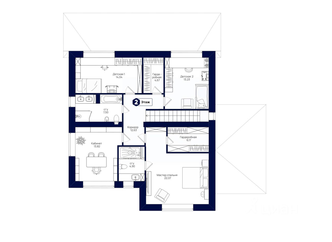 Второй этаж вмещает мастер-спальню с собственной ванной и гардеробной. В двух других спальнях смогут разместиться дети разного возраста или другие члены семьи. Светлая комната отдыха станет идеальным пространством для вашего хобби.