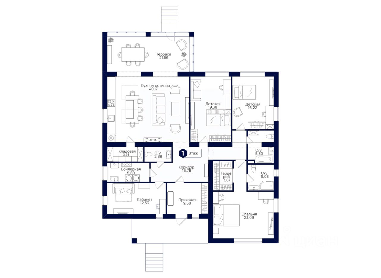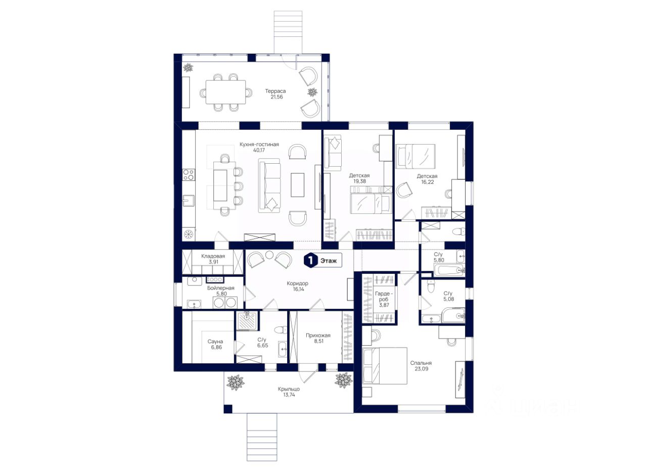 Дом удачно разделён на общую зону, которая состоит из прихожей, кухни с кладовой, гостиной и банного комплекса, и на приватную территорию только для владельцев дома и их детей. Предусмотрен камин.
