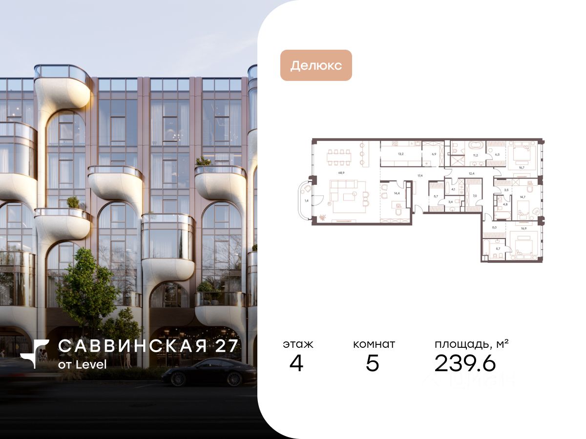 В историческом районе Хамовники продаются 5-к апартаменты площадью 239.60 кв.м, расположенные на 4 этаже делюкс-резиденции Саввинская 27 от Level.