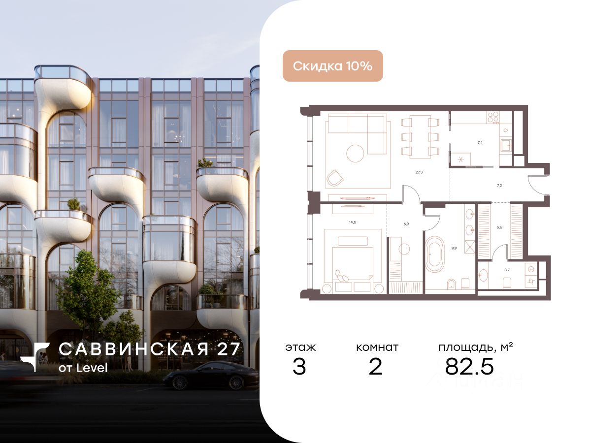 В историческом районе Хамовники продаются 2-к апартаменты площадью 82.50 кв.м, расположенные на 3 этаже делюкс-резиденции Саввинская 27 от Level.