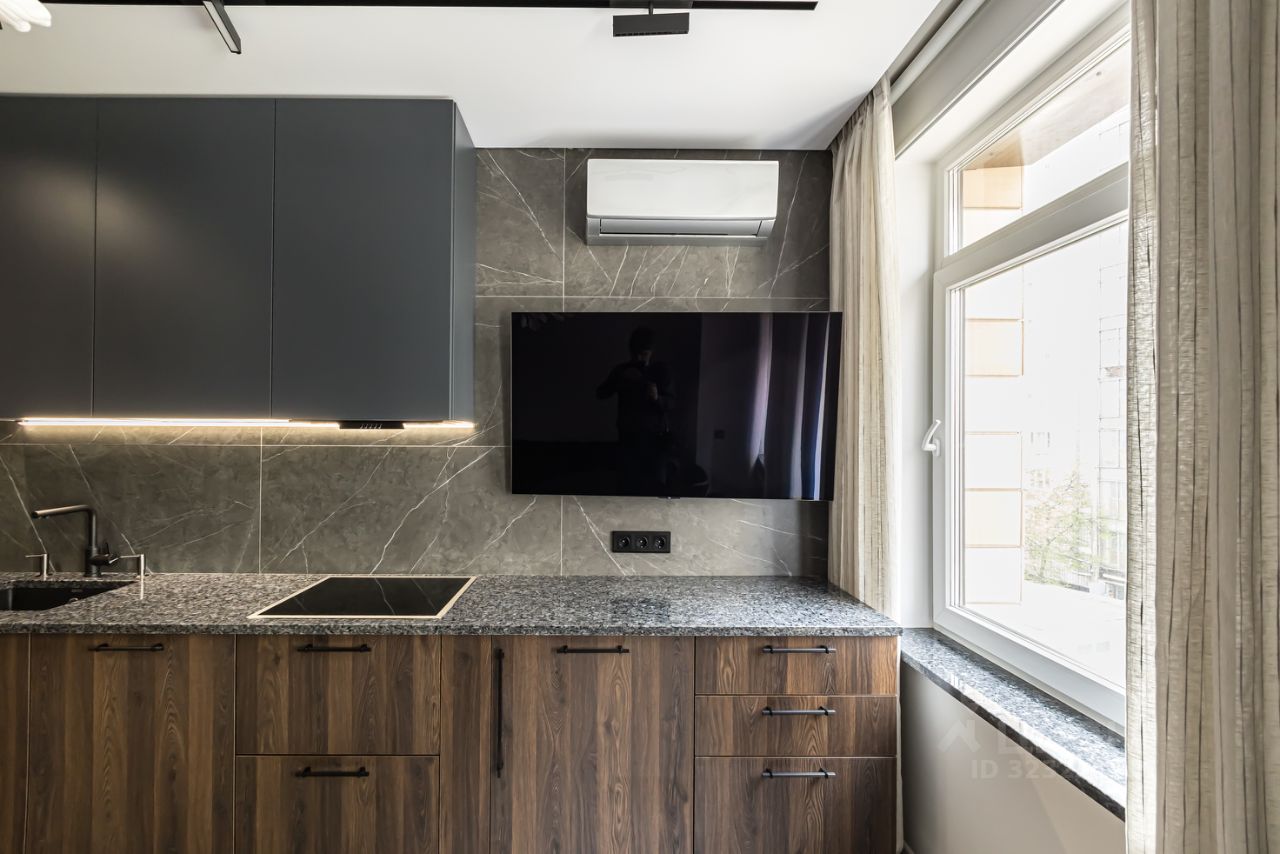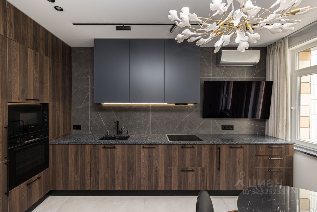 Кухонный гарнитур Manacor с встроенной техникой : Посудомоечная машина Bosch Духовой шкаф Bosch Холодильник Kuppersberg Морозильная камера Kuppersberg Вытяжка Kuppersberg Варочная индукционная панель Bosch Микроволновая печь Bosch Кондиционер General Electric Столешница Blue pearl гранит Стол обеденный (дерево, керамика) и кожаные кресла 2 шт. Диван на кухне (кожа, дерево) Loft design Телевизор LG QLED 55 Подоконники гранит